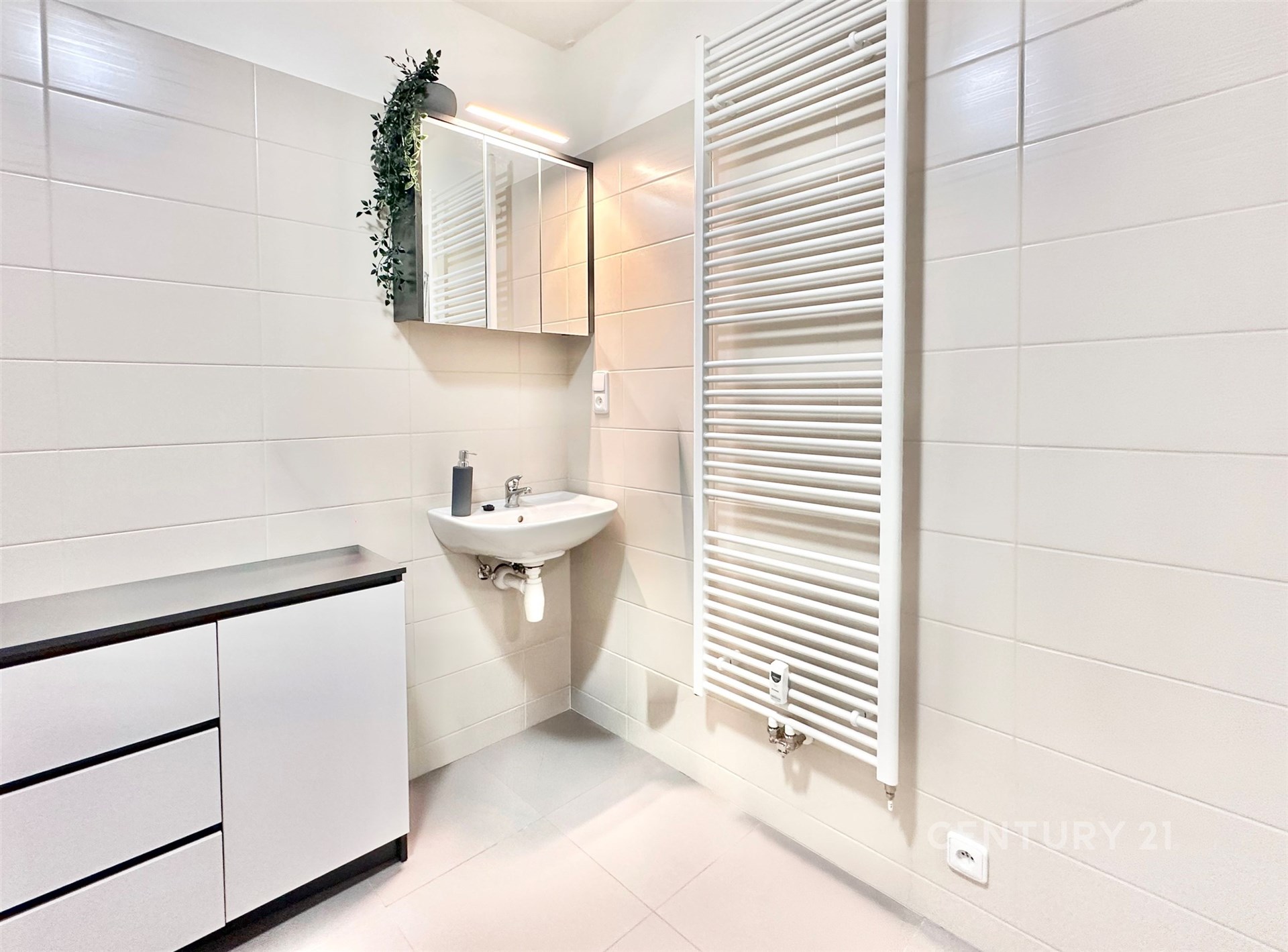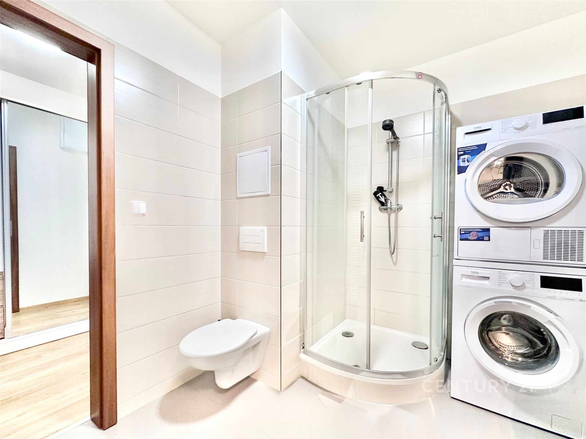 Elegantní koupelna pro Váš relax: Čisté linie, světlá keramika a prakticky řešený prostor s prostorem pro pračku i sušičku v sestavě nad sebou.