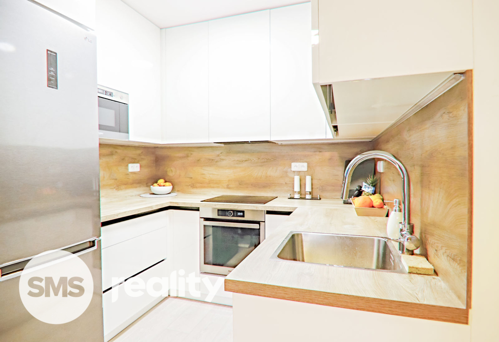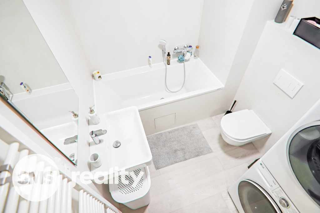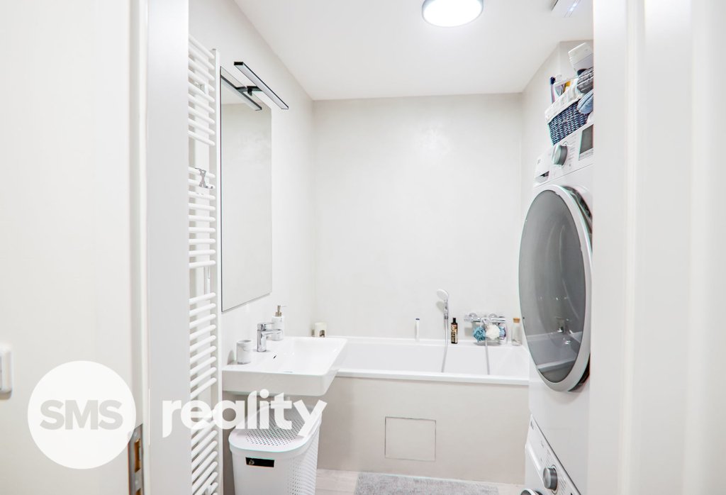 Součástí bytu je základní vybavení: kuchyňská linka se spotřebiči v koupelně je pračka, sušička, klasická vana a umyvadlo.