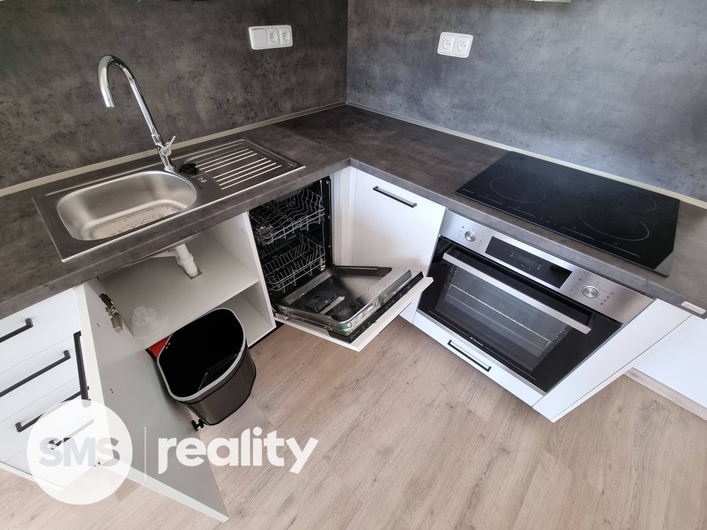 Byt je vybaven kuchyňskou linkou (trouba, indukční varná deska, myčka, digestoř), v koupelně je