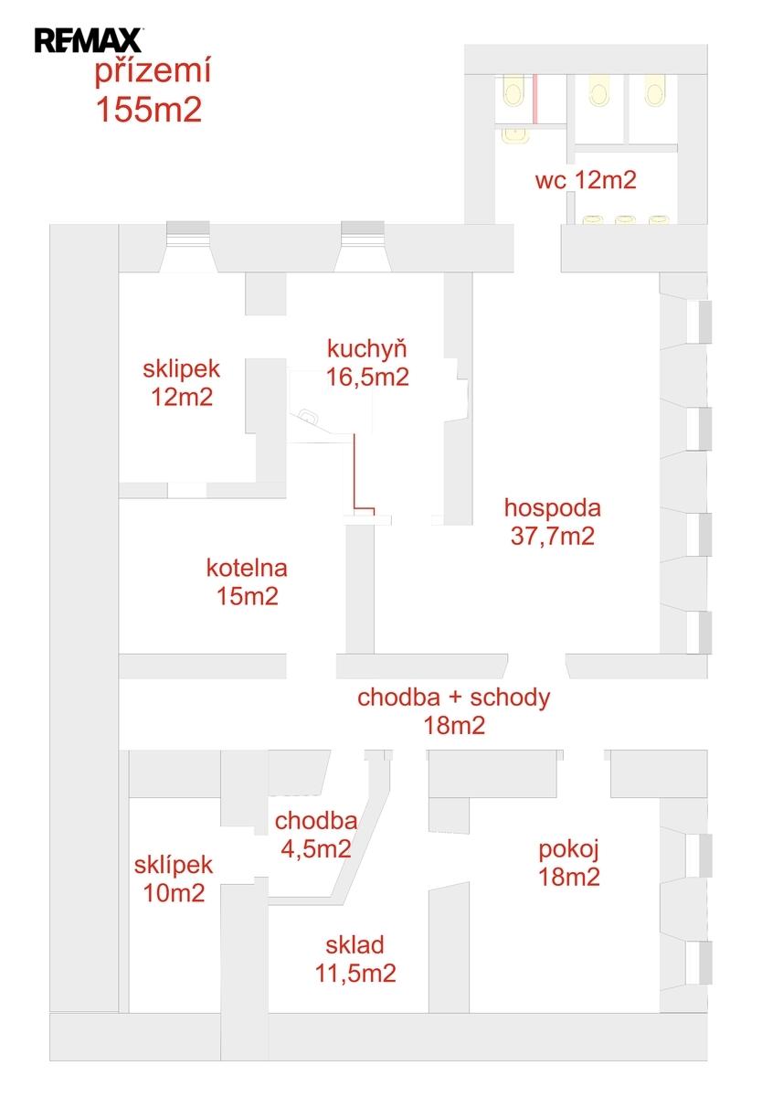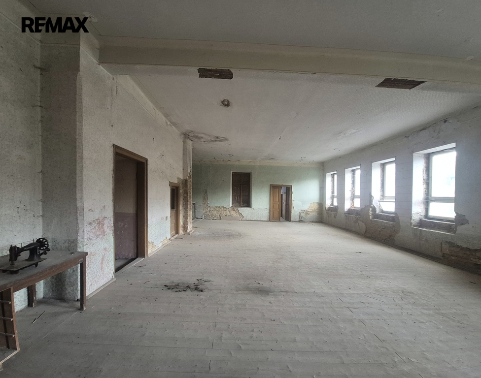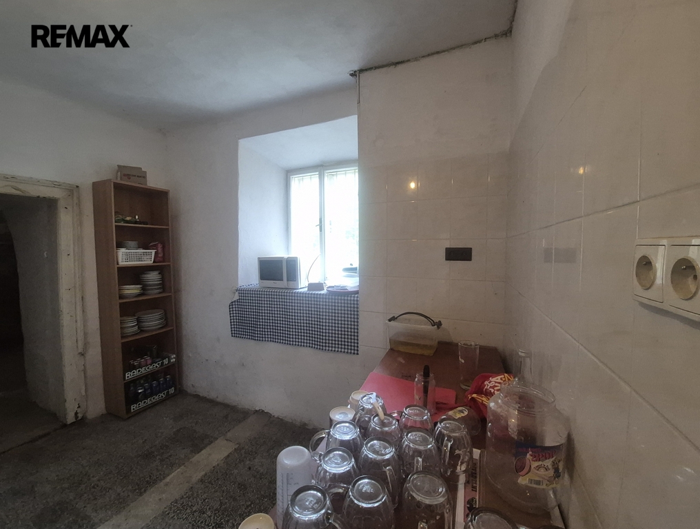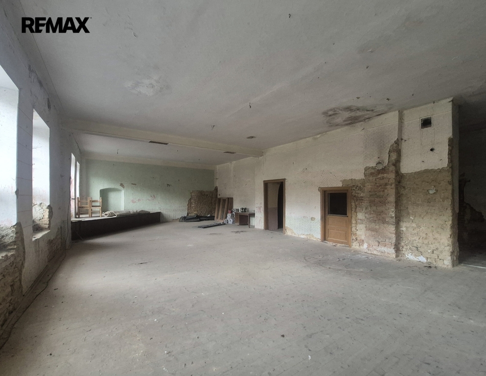 V přízemí o celkové výměře 155 m2 se nachází bývalý lokál hostince o výměře cca 38 m2, navazující malá kuchyňka, dále příslušenství, sklady, kotelna, sklípek a sociální zařízení.