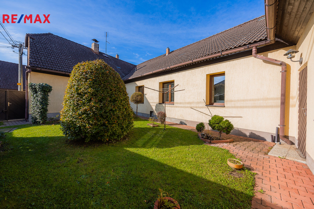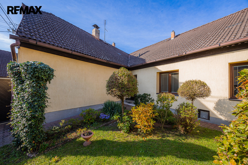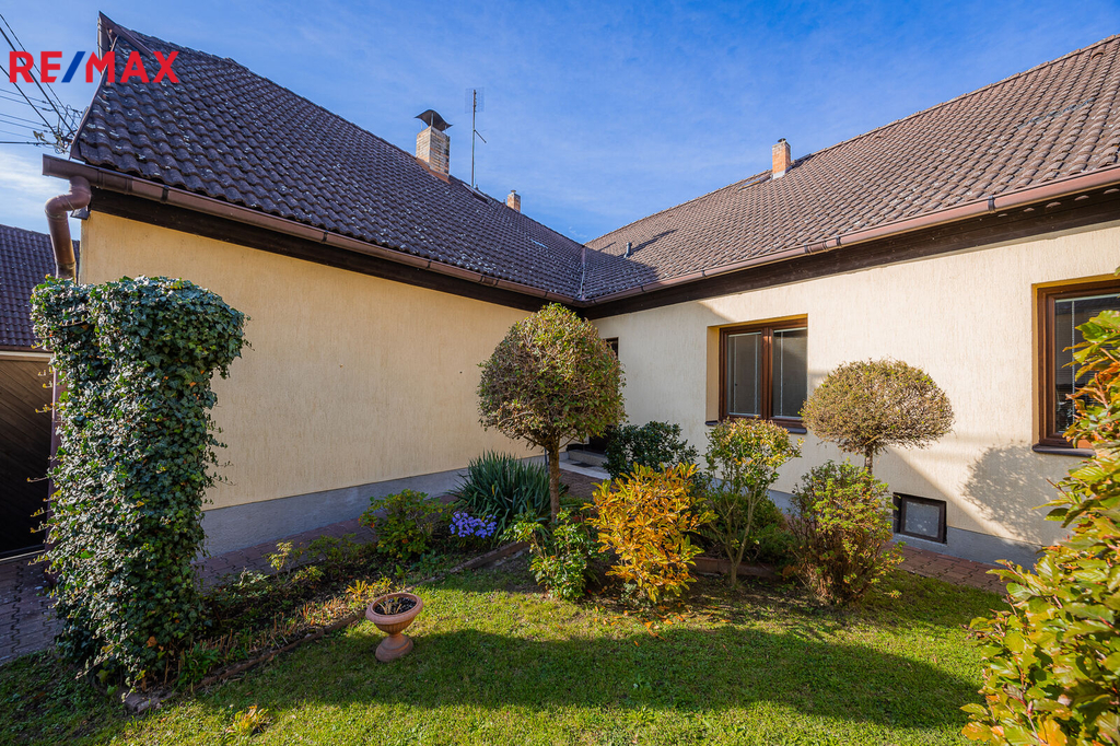 Uzavřený dvůr poskytuje soukromí pro rodinu, děti i relax. Součástí je i kryté parkovací stání a okrasné dřeviny, které dotvářejí příjemnou atmosféru.