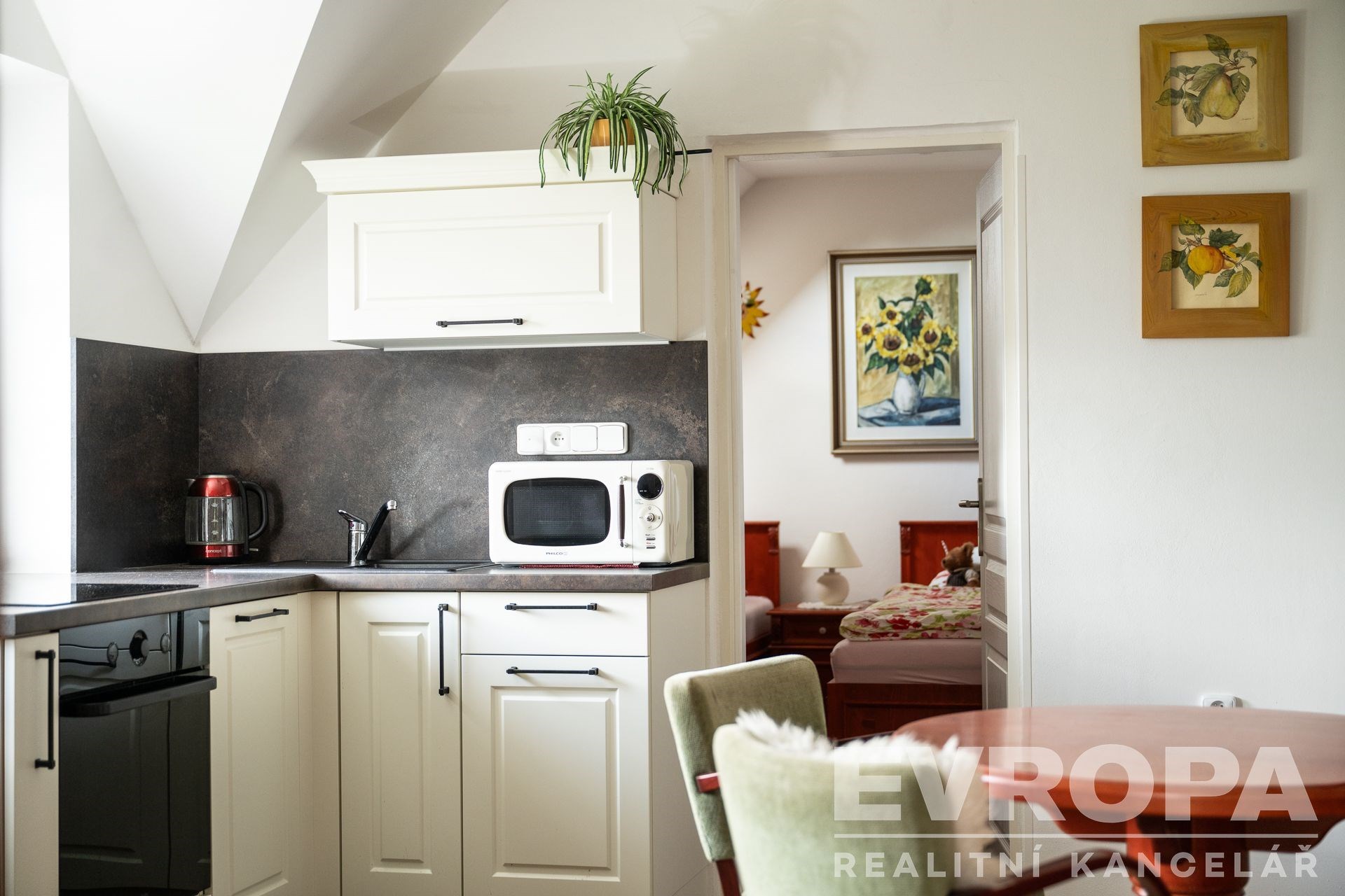 V ceně apartmán 2kk s terasou, místnost 1kk 9,6 m2 s koupelnou i kuchyňkou, koje 3,6m2, podíl na prostoru apartmánového bistra v hodnotě 250 000, Kč, sklepní vestavěná skříň 0,6m2.