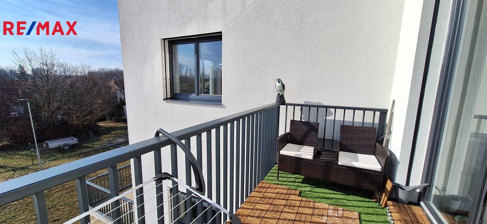 Z obývacího pokoje je vstup na slunný a prostorný balkon, kde je možné relaxovat.