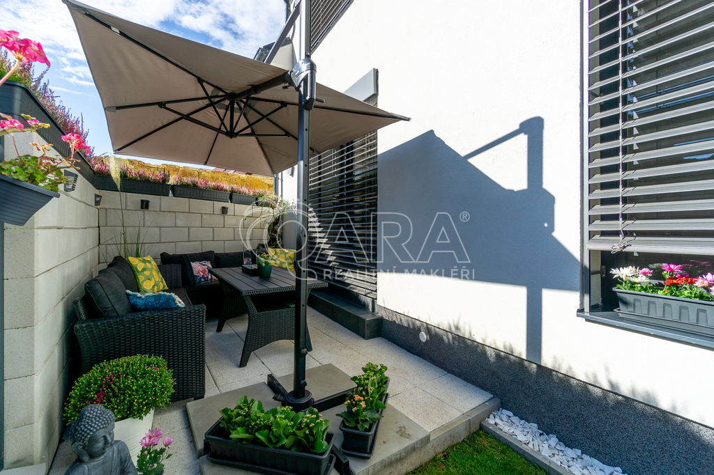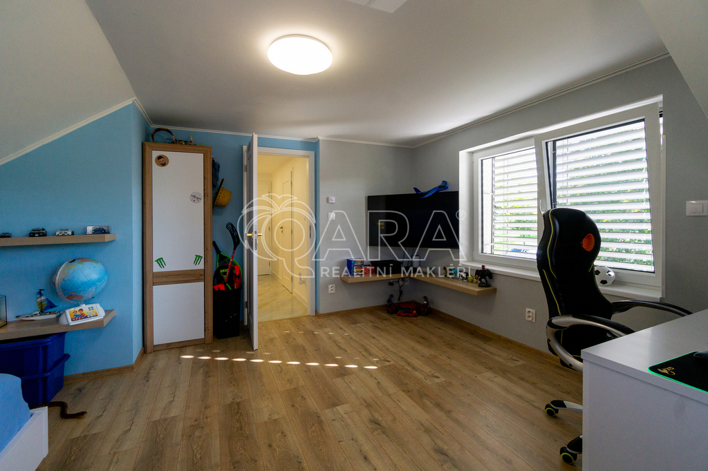 V přízemí domu je situována vstupní chodba, technická místnost, toaleta, šatna a prostorná kuchyně spojená s obývacím pokojem. V patře se nachází chodba, ze které se vstupuje do ložnice s šatnou a dětského pokoje, prostorné koupelny s rohovou vanou, bidetem a toaletou. Zdobné schodiště spojuje obě patra. Pohodlná terasa na předzahrádce poskytuje relaxační prostor pro odpočinek v klidném prostředí. Na zahrádce nechybí ani menší zahradní domek na uskladnění kol a sekačky.