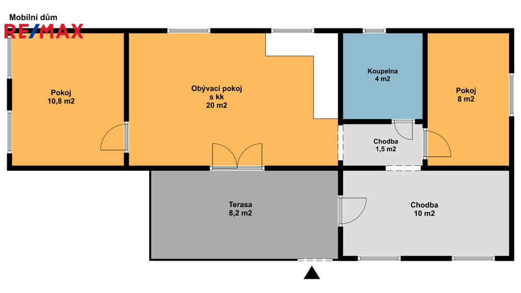 Mobilní dům má dispozici 3 + kk s podlahovou plochou 54 m2 a terasou 8 m2.