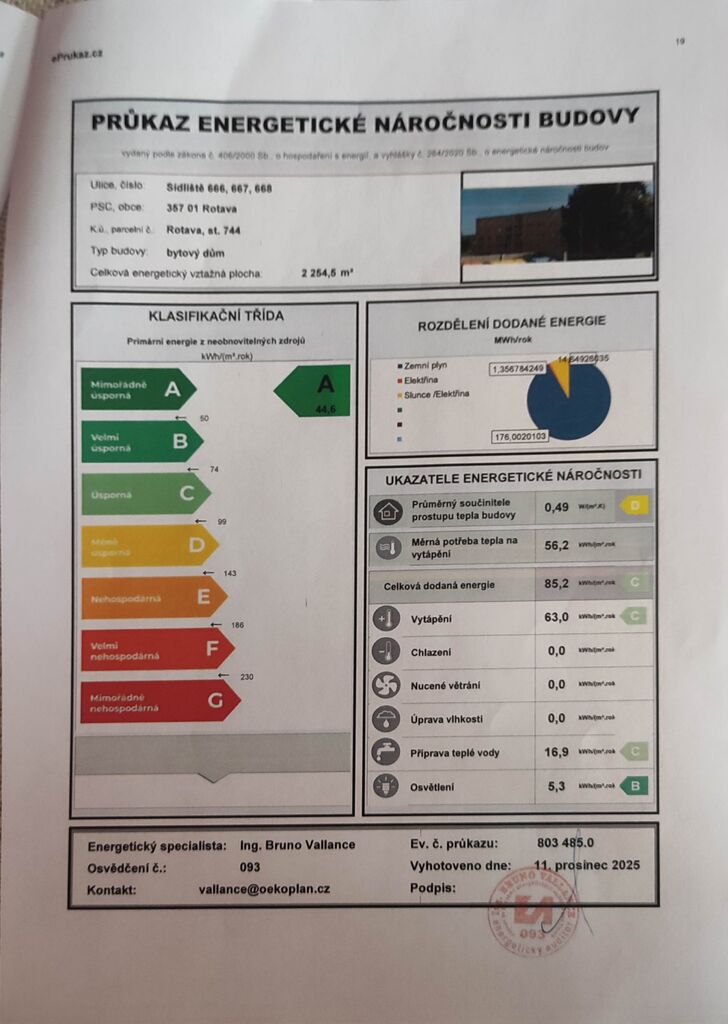 - Ukazatel energetické náročnosti budovy: 44.6 kWh/m²