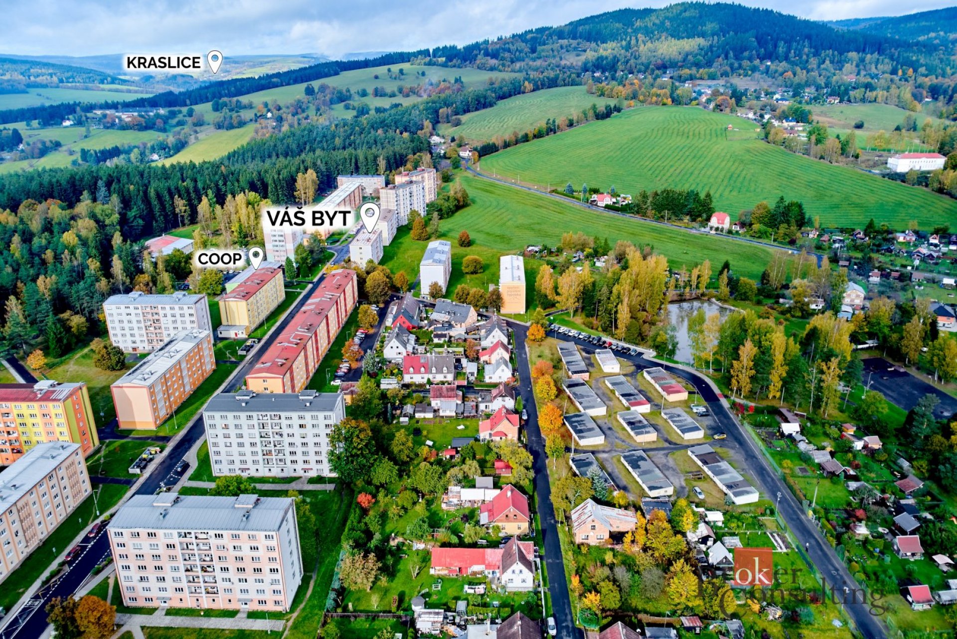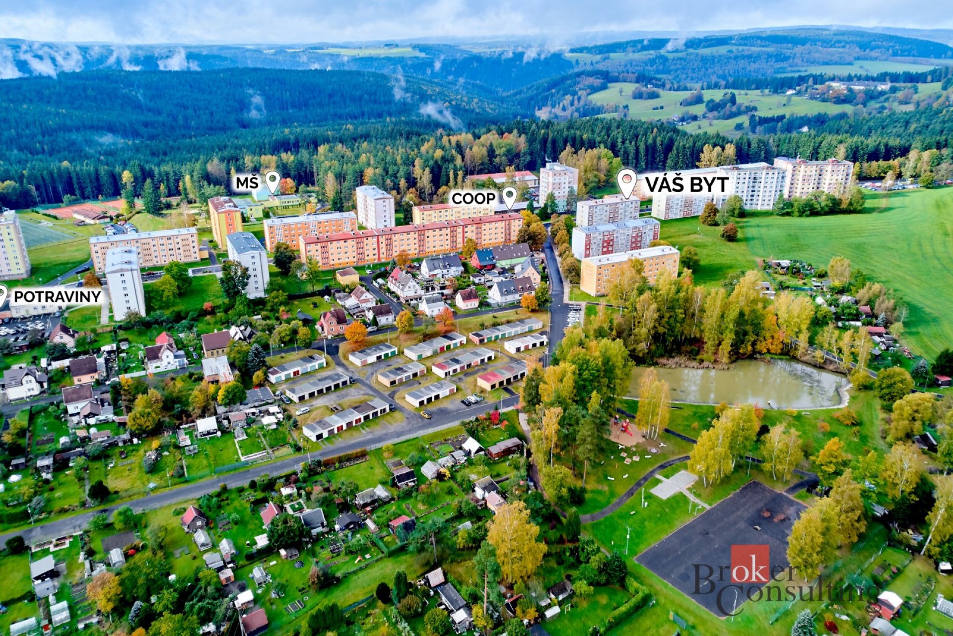 Velkou předností bytu je krásný výhled do okolní krajiny, který umocňuje klidnou atmosféru lokality. V bezprostřední blízkosti se nachází rotavský rybníček s posezením, ideální pro relaxaci i procházky.