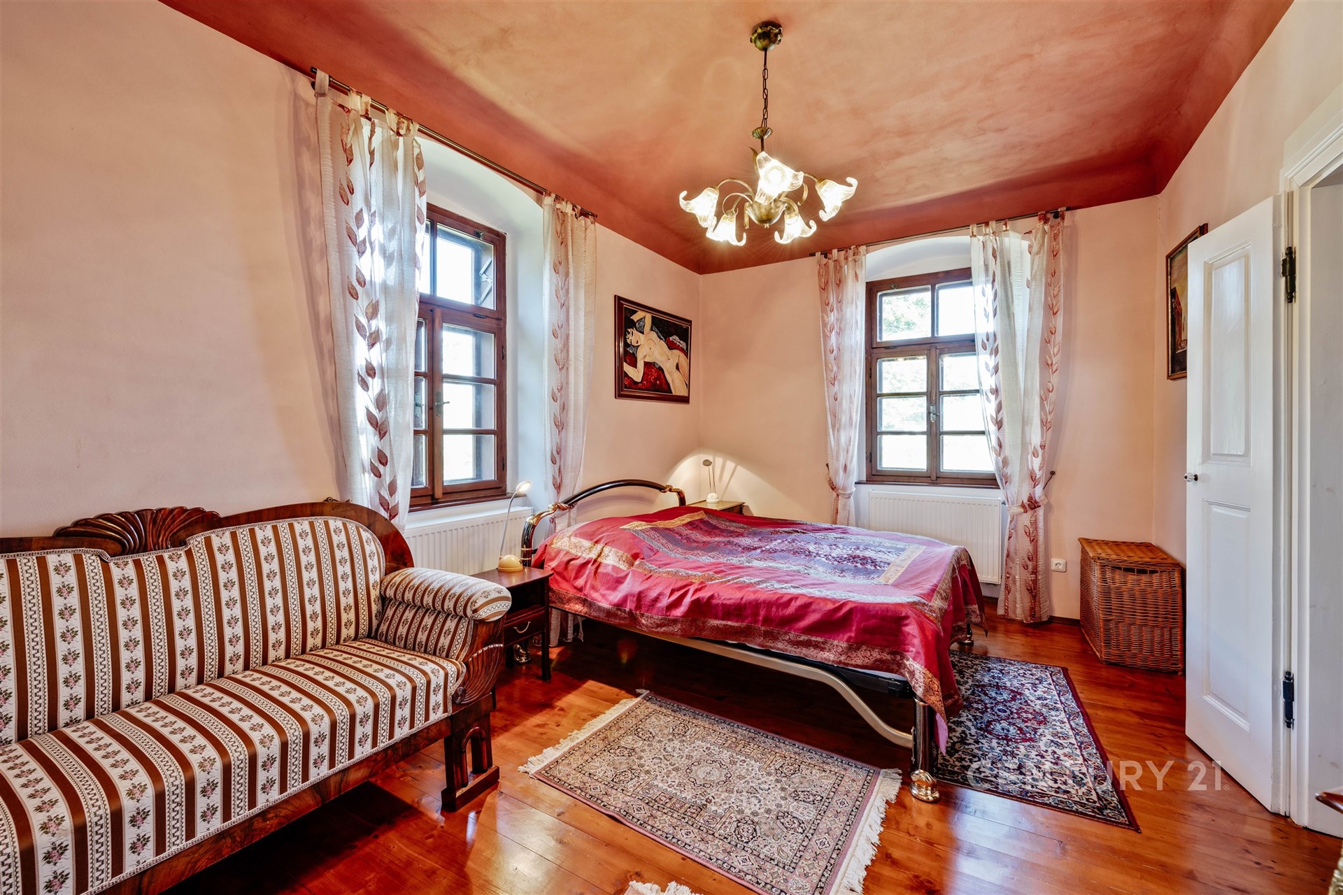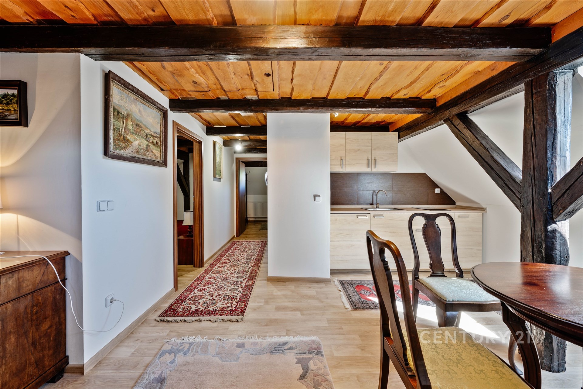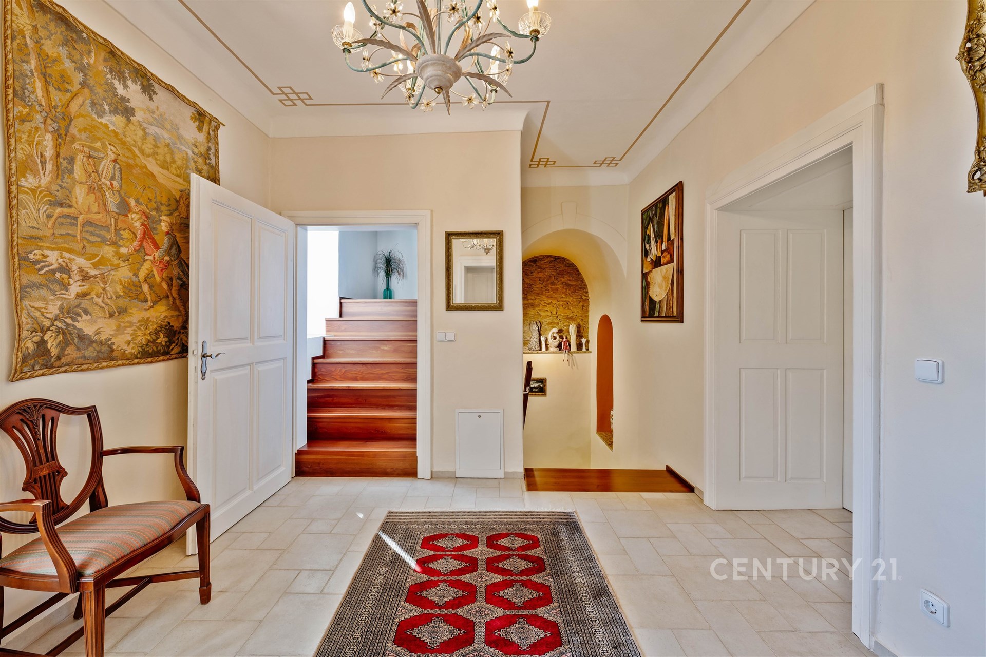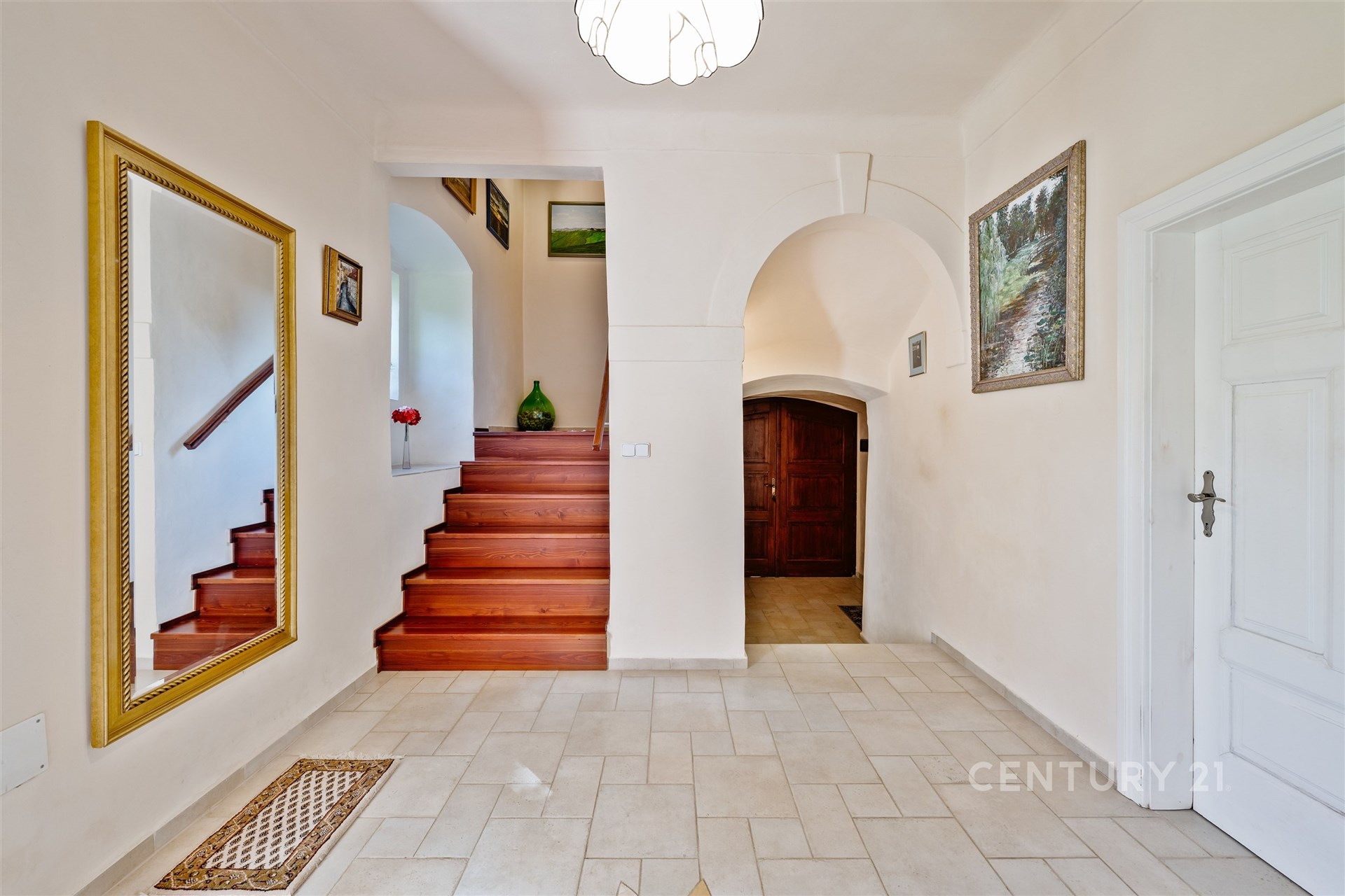 Srdcem domu je prostorná vstupní hala s centrálním schodištěm, které propojuje všechna podlaží včetně menšího sklepa. V přízemí se nachází kuchyně, jídelna s krbovými kamny, druhý pokoj, samostatné WC, vstupní chodba vedoucí do sklepa a technické místnosti a dále hala se schodištěm do patra. Zde na vás čeká reprezentativní společenský salon – místnost, která v sobě nese noblesu dávných časů a zároveň nabízí útulnost domova. Dřevěné prvky, knihovna i působivá atmosféra činí ze salonu místo jako stvořené pro rodinná setkání, posezení s přáteli nebo chvíle v klidu u dobré knihy či k reprezentativním příležitostem, které zanechají silný dojem na každého hosta. Dále je v patře ložnice, šatna a prostorná koupelna se sprchovým koutem, rohovou vanou, WC a bidetem. Podkroví s přiznanými trámy dnes slouží k ubytování návštěv a jsou zde dva pokoje, obývací pokoj s kuchyňským koutem a koupelna se sprchou a WC.