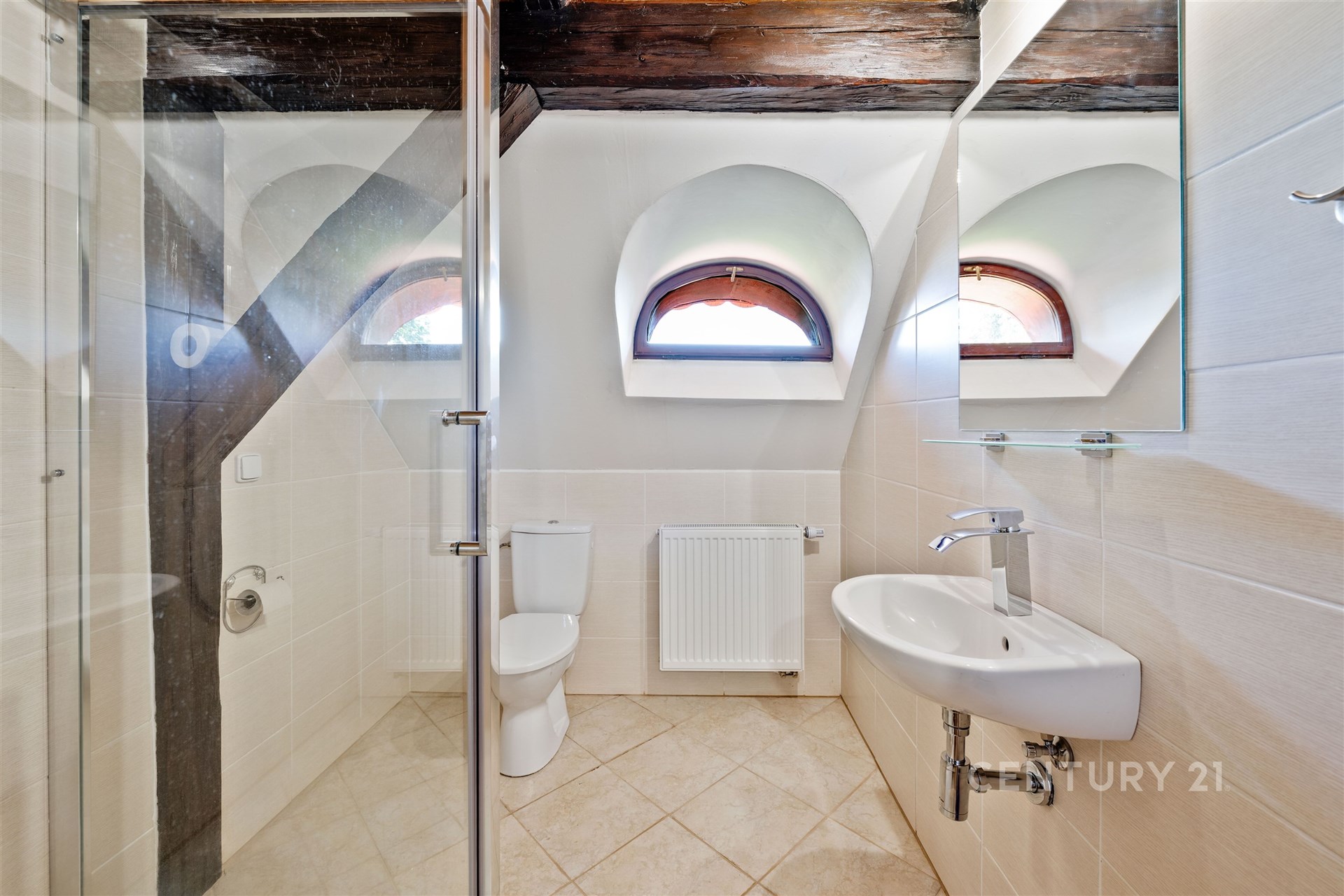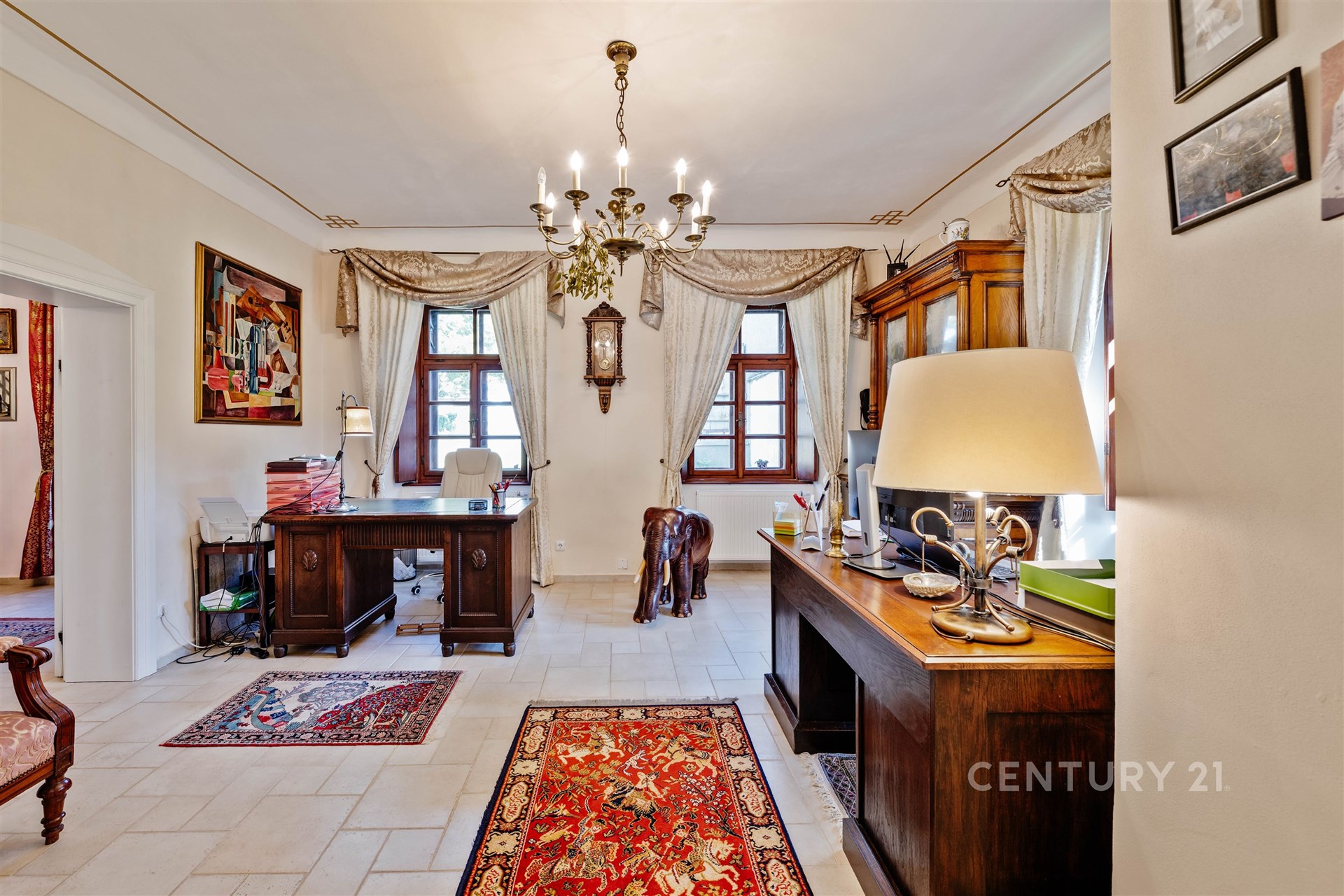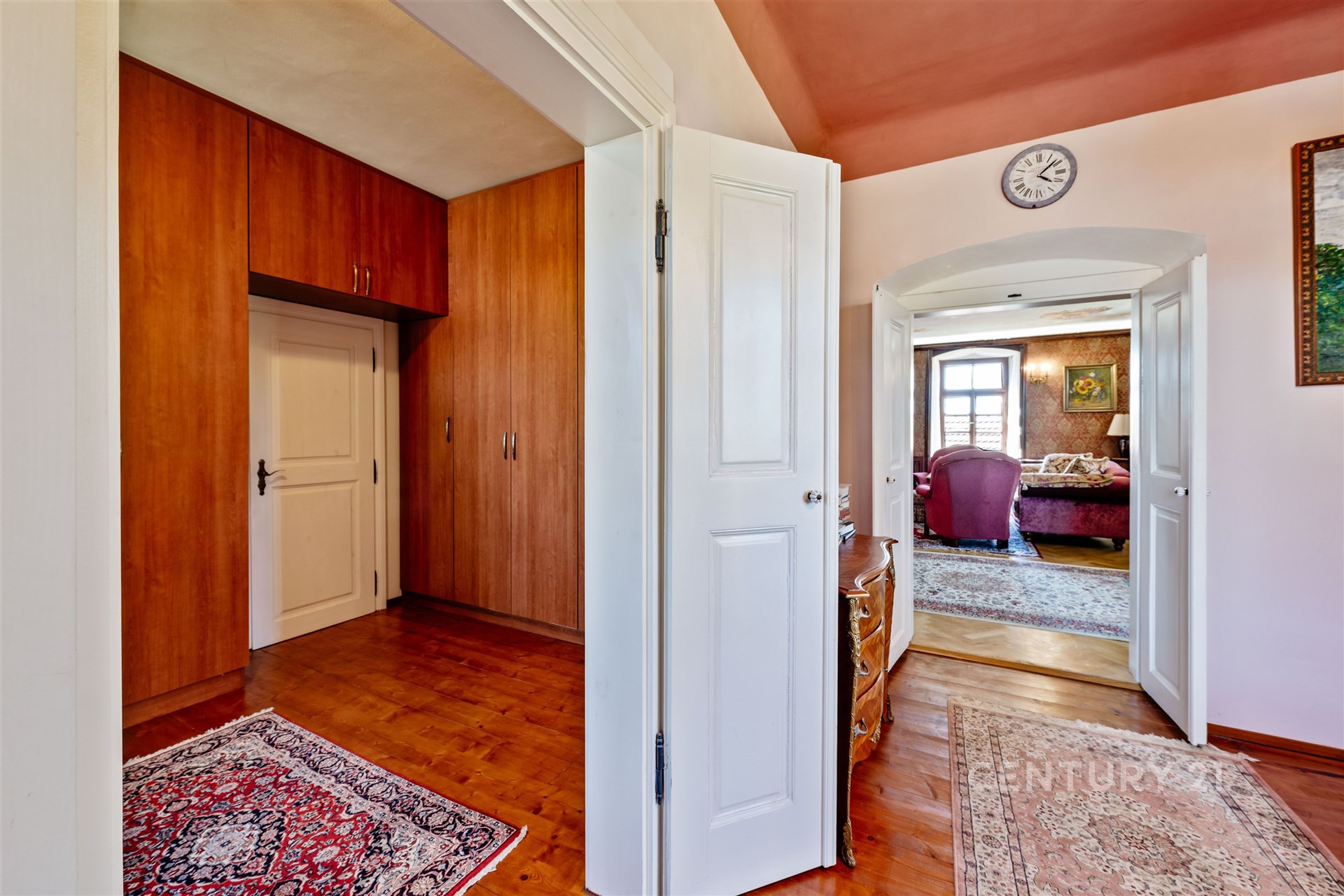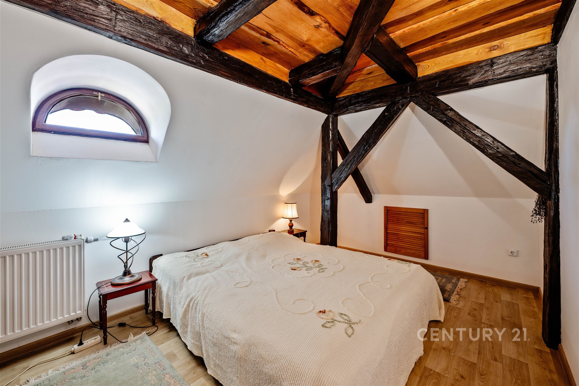 Srdcem domu je prostorná vstupní hala s centrálním schodištěm, které propojuje všechna podlaží včetně menšího sklepa. V přízemí se nachází kuchyně, jídelna s krbovými kamny, druhý pokoj, samostatné WC, vstupní chodba vedoucí do sklepa a technické místnosti a dále hala se schodištěm do patra. Zde na vás čeká reprezentativní společenský salon – místnost, která v sobě nese noblesu dávných časů a zároveň nabízí útulnost domova. Dřevěné prvky, knihovna i působivá atmosféra činí ze salonu místo jako stvořené pro rodinná setkání, posezení s přáteli nebo chvíle v klidu u dobré knihy či k reprezentativním příležitostem, které zanechají silný dojem na každého hosta. Dále je v patře ložnice, šatna a prostorná koupelna se sprchovým koutem, rohovou vanou, WC a bidetem. Podkroví s přiznanými trámy dnes slouží k ubytování návštěv a jsou zde dva pokoje, obývací pokoj s kuchyňským koutem a koupelna se sprchou a WC.
