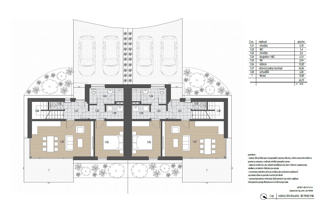 Dispozice: 1.NP - vstupní chodba (7,78m2), koupelna se sprch. koutem, umyvadlem a WC (6,14m2), WC (1,4m2), technická místnost (2,94m2), pokoj (12,20m2), obývací pokoj s kuchyňským koutem (26,86m2), chodba se schodištěm (6,38). Z obýváku je vstup na terasu o výměře 12m2. Plocha parkovacího stání pro 2 auta 36m2.