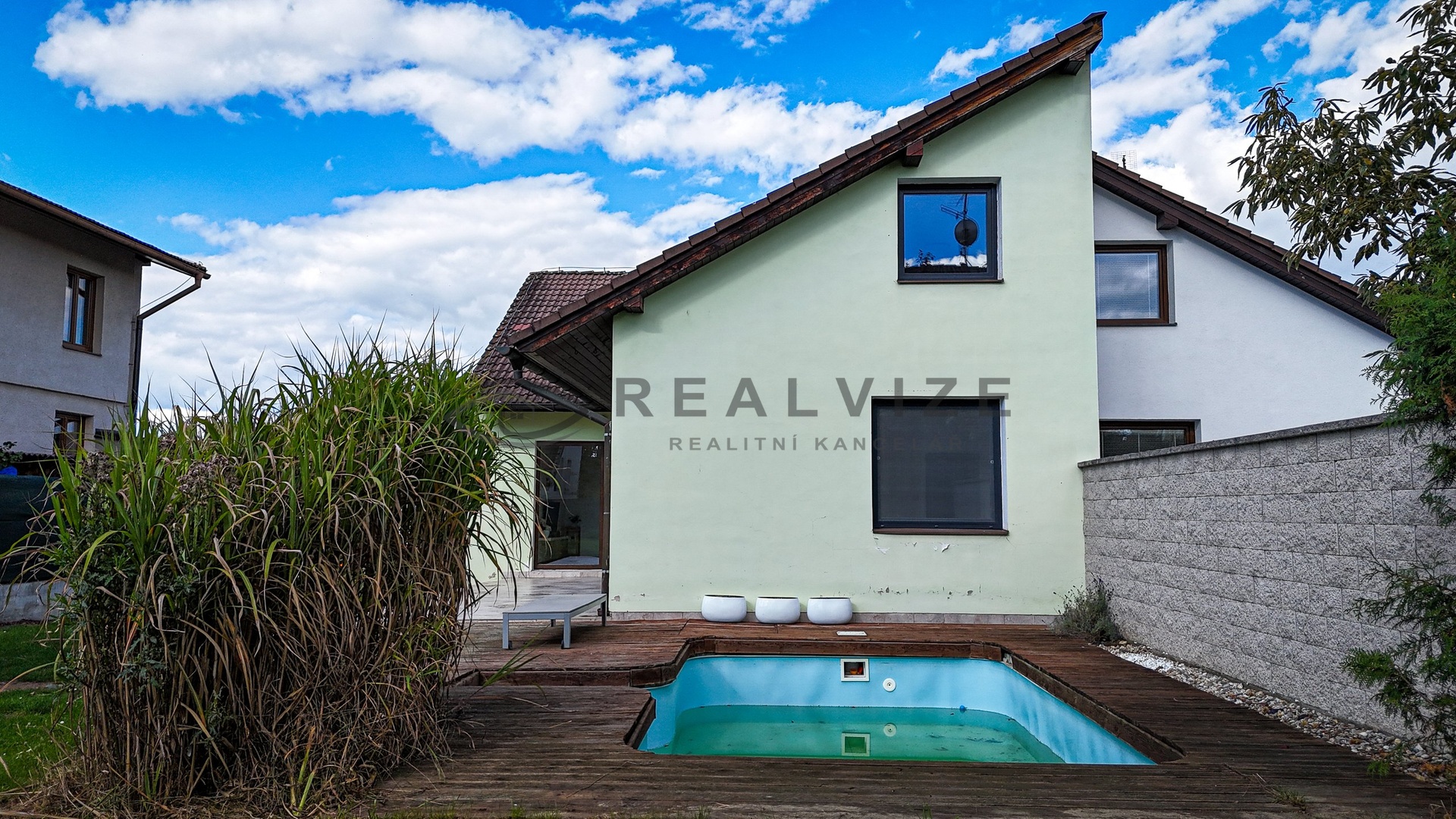 K domu náleží garáž, kterou lze projet z ulice do zahrady, terasa a zapuštěný bazén, ideální pro letní odpočinek.