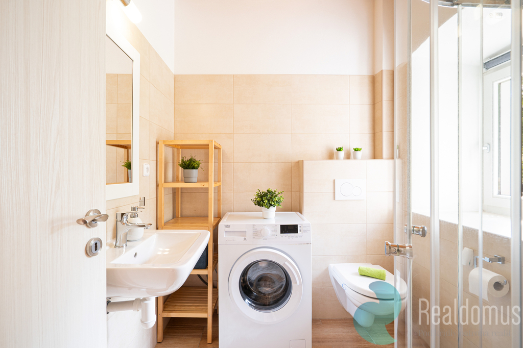 – Koupelna se sprchovým koutem, WC a pračkou