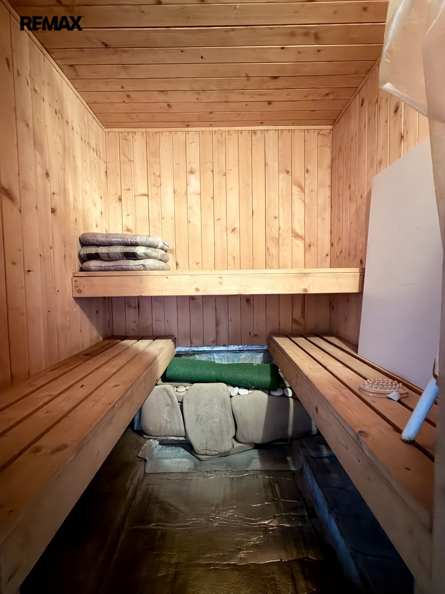 V přízemí domu je obývací pokoj s krbovými kamny, kuchyň, chodba, wc a sprchový kout (chybí klasická koupelna). V tomto podlaží je dále prostorná garáž, místnost s vícero využitím a menší sauna.