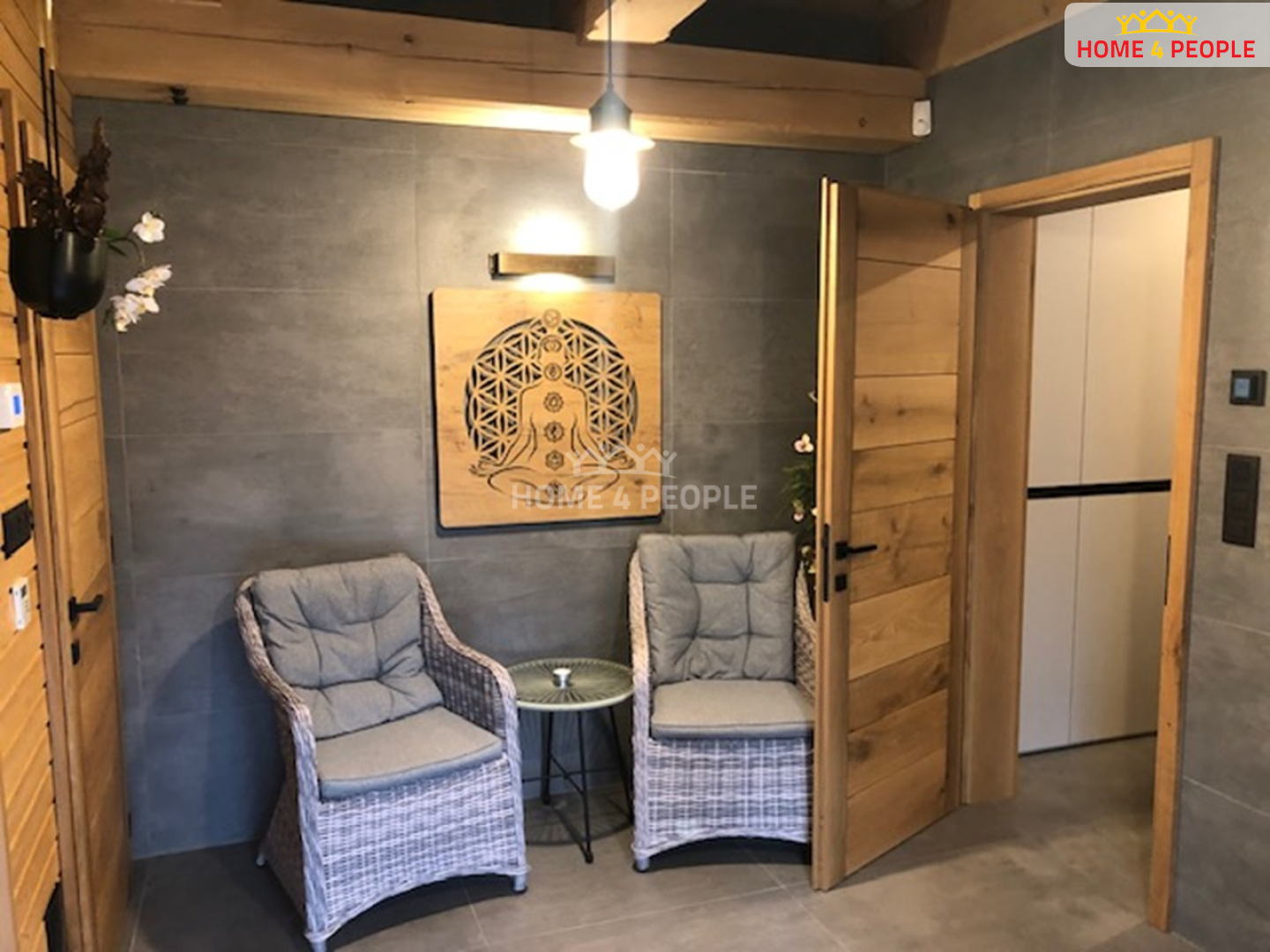 Samotný interiér je vybaven stylovým dřevěným nábytkem na míru s prvky exotiky, které dodávají příjemnou luxusní atmosféru života na horách spojených s odpočinkem a relaxací.