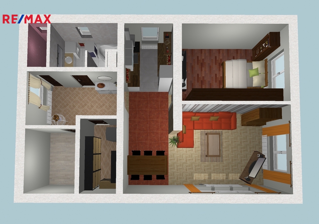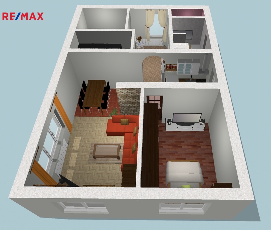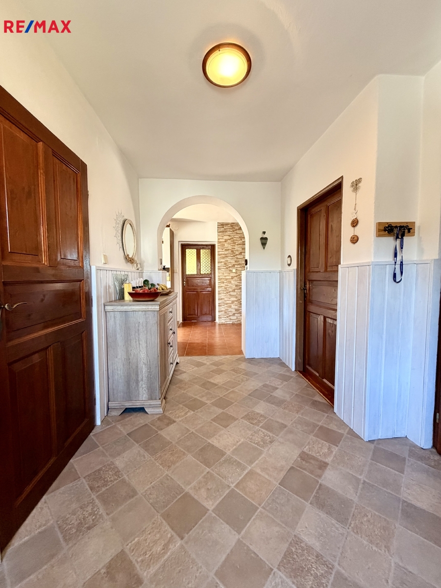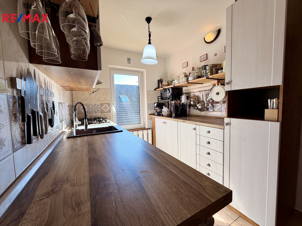 Byt o podlahové ploše 70 m2 je situovaný v patře rodinného domu. Je ve velmi pěkném stavu, rekonstrukce proběhla před dvaceti lety. Je vybavený nábytkem dle fotografií (majitel si odveze akorát postel, komodu a knihovničku z ložnice a TV + křeslo z obýváku). K dispozici je i plně vybavená kuchyňská linka včetně myčky, lednice a pračky).