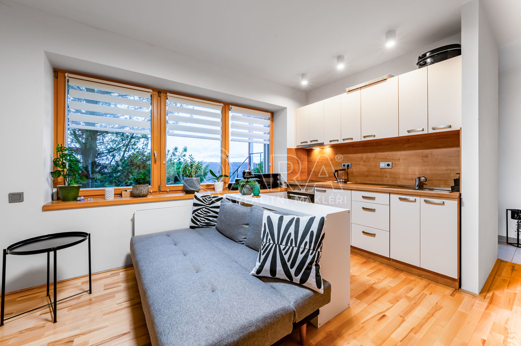 Druhá bytová jednotka má separátní vchod ze zahrady. Dispozice 2kk se skládá z obývacího pokoje s kuchyňským koutem, ložnice s přímým vstupem na vlastní terasu, koupelna a oddělená toaleta.