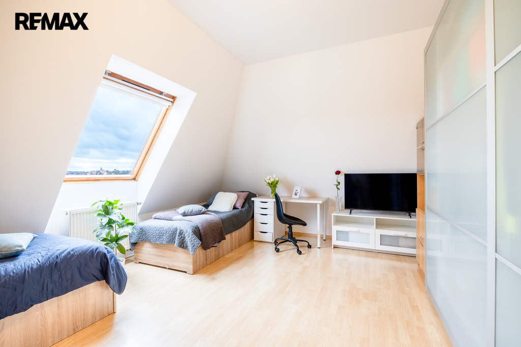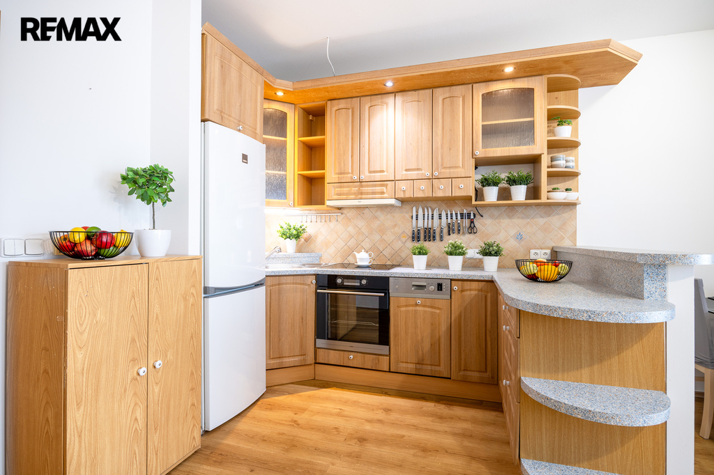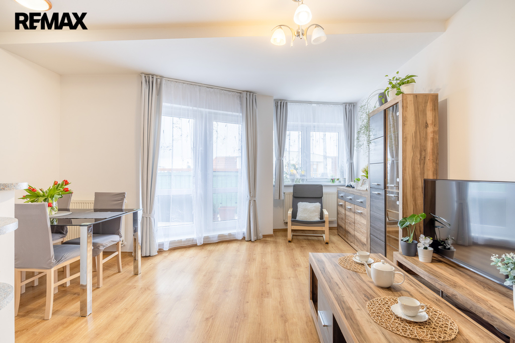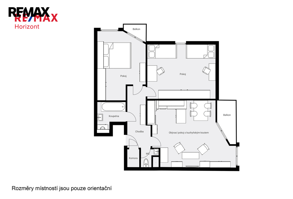 Dispozičně je byt řešen velmi prakticky. Obývací pokoj s kuchyňskou linkou a vestavnými spotřebiči tvoří přirozené centrum bytu – místo, kde se potkává každodenní život. Dvě samostatné ložnice nabídnou dostatek soukromí, ať už pro rodinu, pár nebo práci z domova. Nechybí koupelna s vanou, samostatná toaleta ani technická místnost se skladovacím prostorem, který v bytě vždy potěší. Byt je světlý a díky dvěma balkonům se v létě nabízí příjemné posezení s orientací na jihozápad – ideální třeba na večerní kávu nebo sklenku vína.
