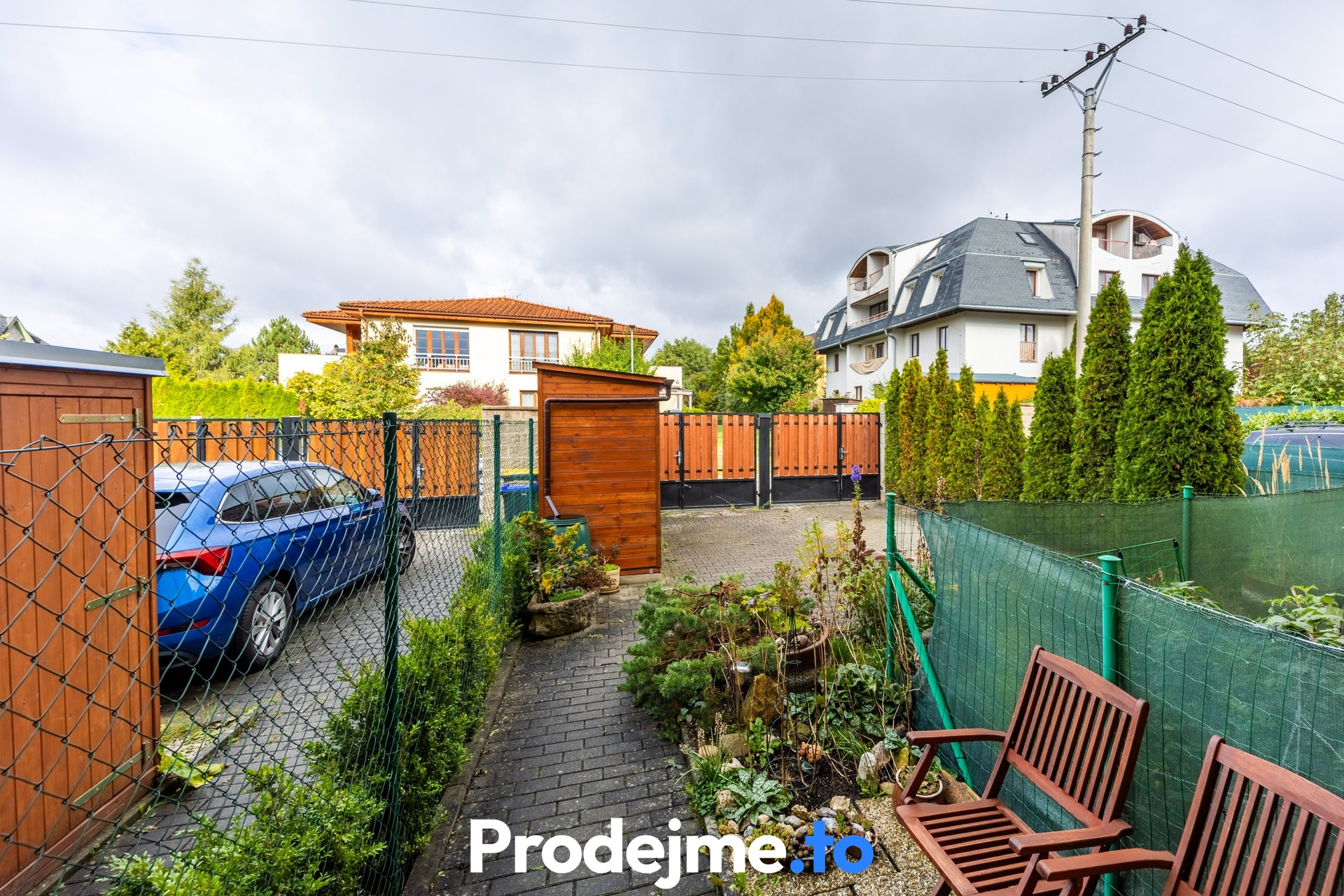 Oplocený pozemek o výměře 54 m² umožňuje pohodlné parkování až dvou vozů. Zahradní domek s přívodem 230 V se hodí pro uložení sezónních věcí i nářadí. Zelený pás záhonů dodává prostoru příjemnou atmosféru malého rodinného domu.