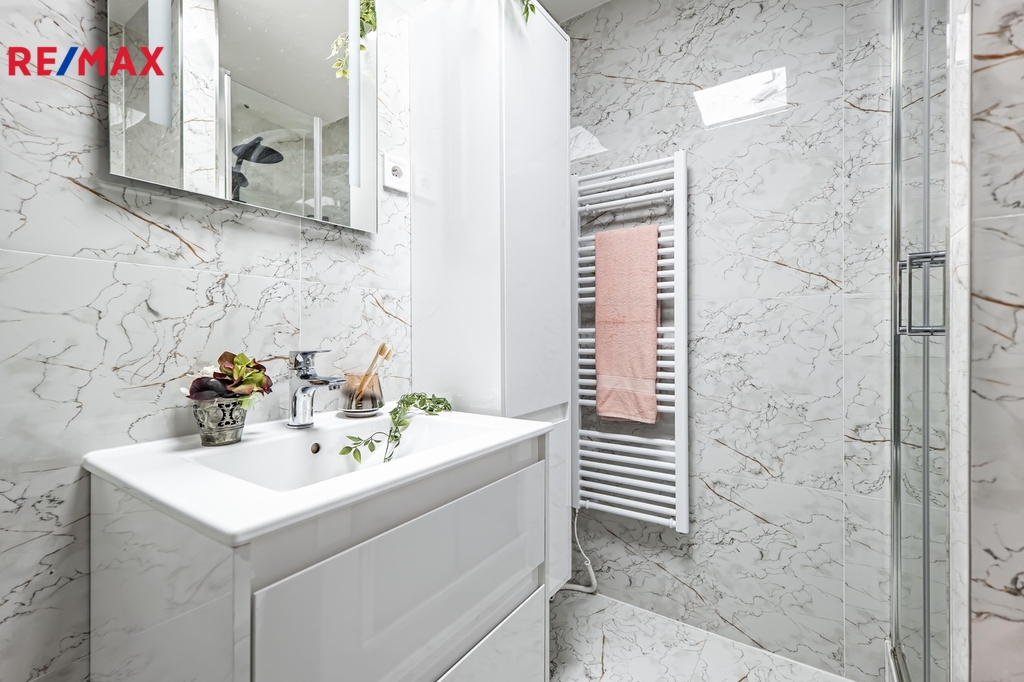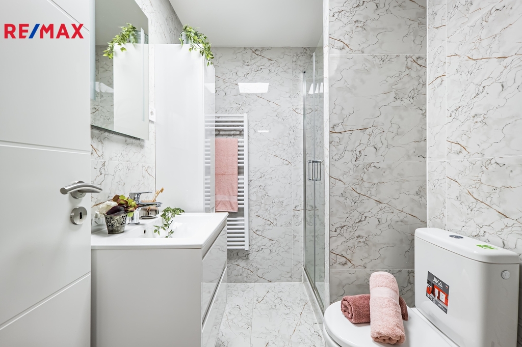 Během rekonstrukce byly využity ty nejlepší materiály. Koupelny jsou obložené mramorem a v obou bytech se nachází vestavěné skříně pro lepší využití prostoru.