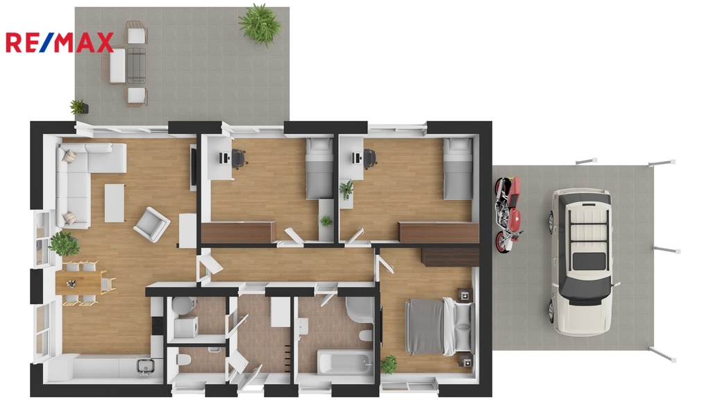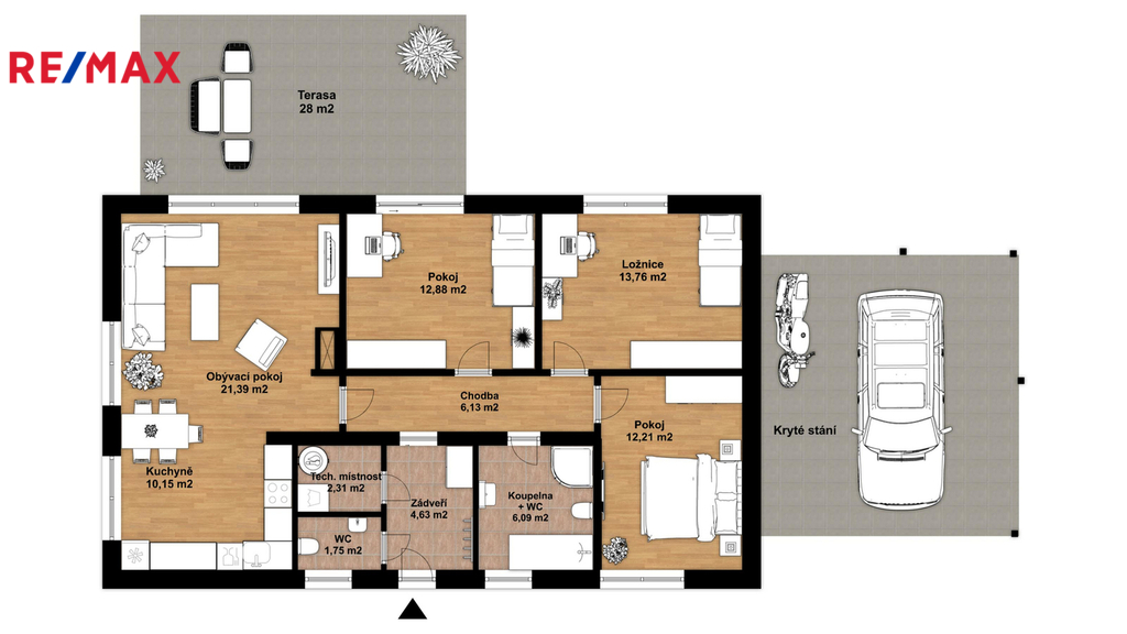 - terasa 28m2, na kterou lze vyjít z obývacího pokoje a samostatného pokoje