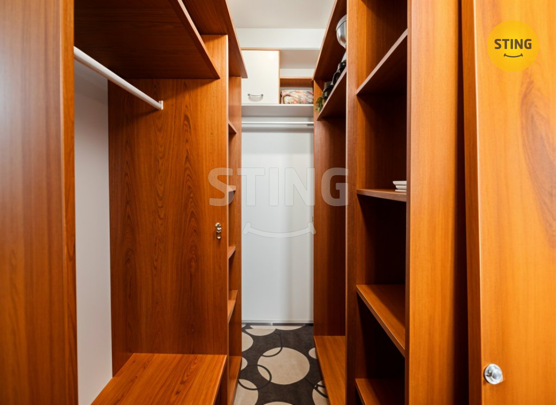 Dva pokoje se šatnou .Možnost vybudovat i druhou koupelnu z prostorů šatny.
