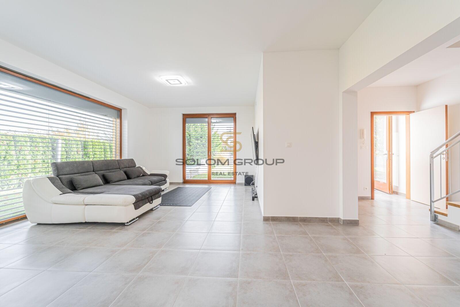 Prostorný obývací pokoj s kuchyňským koutem. Kuchyňská linka vč. vestavěných spotřebičů zn. Bosch: lednice s mrazákem, horkovzdušná trouba, el. varná deska, myčka, vestavný kávovar, digestoř. Z obývacího pokoje vstup na zahradu ze dvou stran.