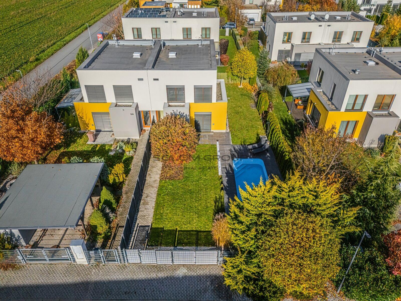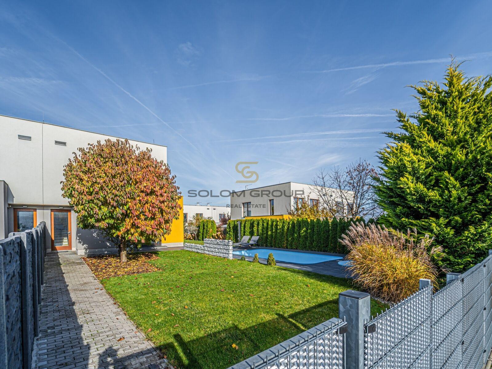 K rodinnému domu přísluší pozemek o výměře 425 m², bazén s protiproudem a slanou vodou, parkovací stání, vjezdová vrata na el. pohon, zahradní závlahový systém.