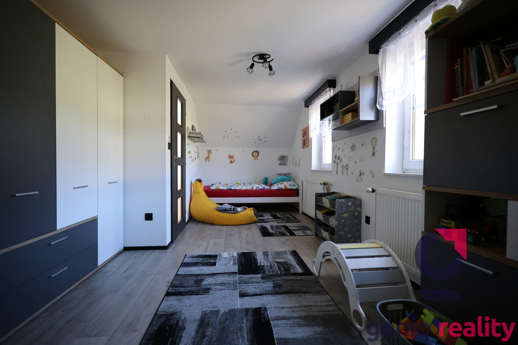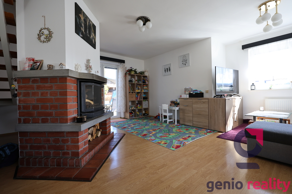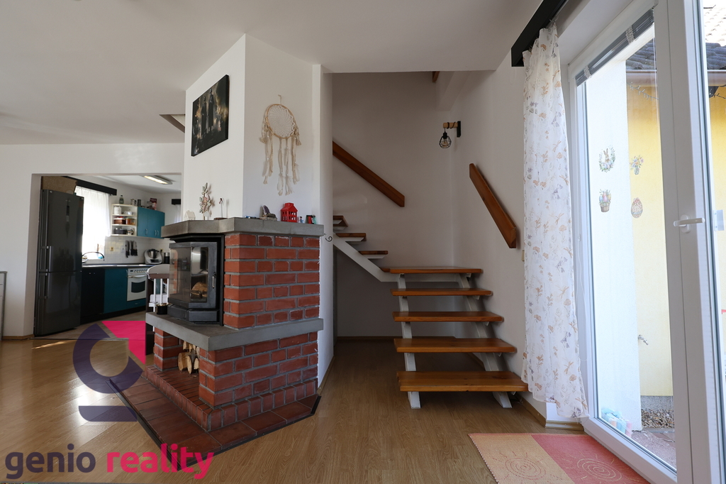 Přízemí (Srdce domova): Po vstupu vás přivítá předsíň s praktickými vestavěnými skříněmi. Hlavní dominantou domu je rozlehlý obývací pokoj, kterému dominuje krb, vytvářející neopakovatelnou atmosféru rodinné pohody. Krb má navíc vyveden horkovzduch do horního patra, takže spolehlivě a krasně vytopí nejen obývací pokoj, ale i ložnice v celém domě. Na obývací část plynule navazuje moderní kuchyňský kout s vestavěnými spotřebiči.