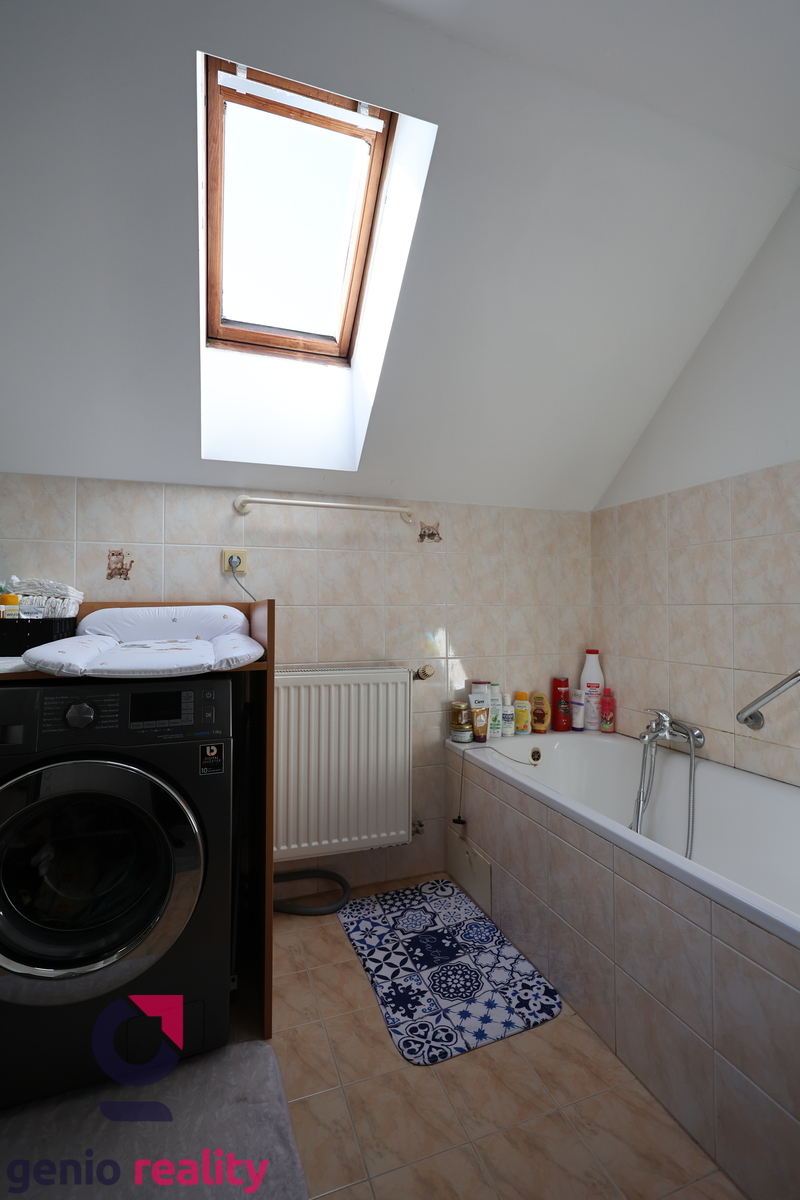 Inženýrské sítě a úspory: Dům je napojen na obecní kanalizaci. Vytápění je řešeno elektrokotlem, přičemž přímo před domem je připravena plynová přípojka. Na zahradě je navíc šikovně ukryta betonová nádrž na dešťovou vodu, takže při zalévání zahrady nemusíte plýtvat drahou městskou vodou.