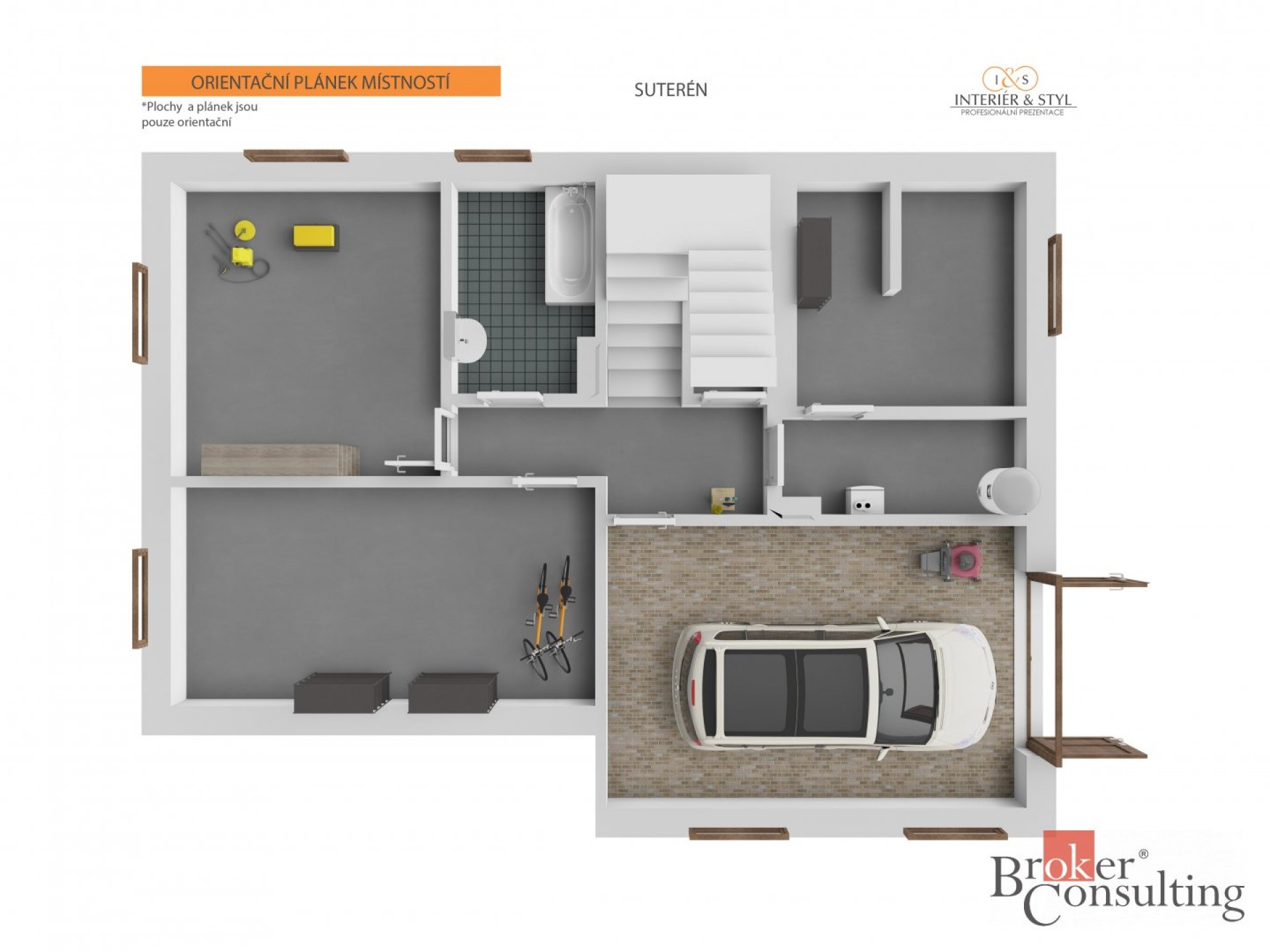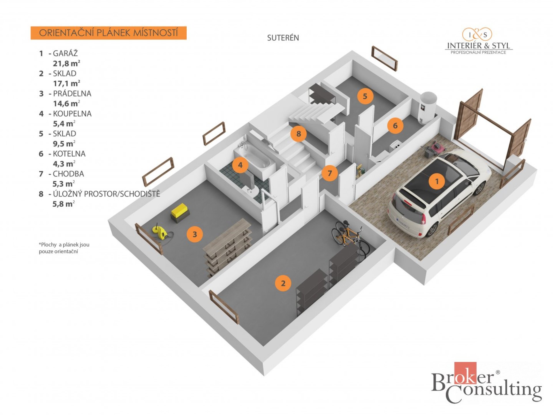 • Podsklepení: garáž, technická místnost (vodárna, kotel), koupelna, uhelná místnost a dvě další místnosti pro skladování.