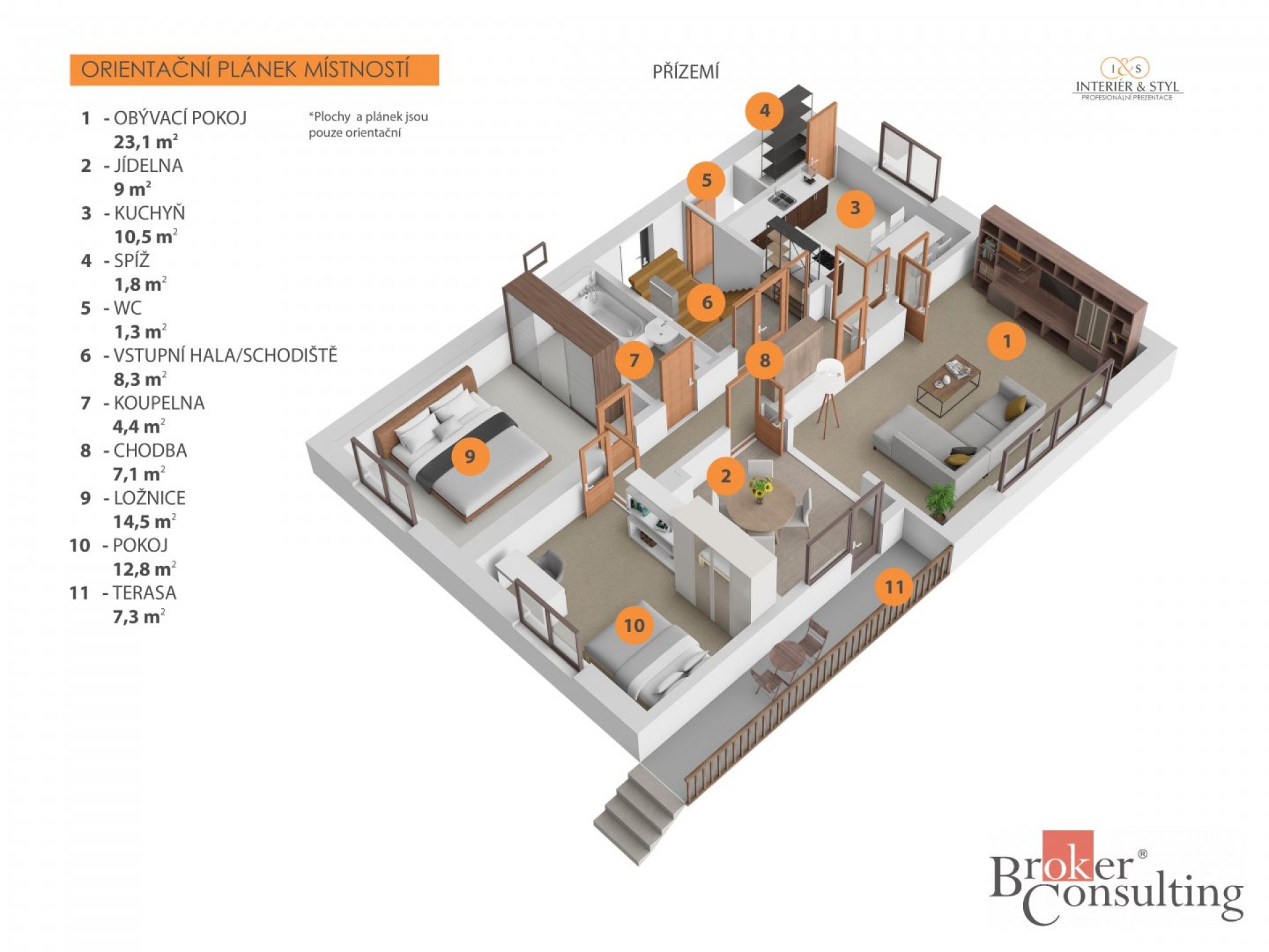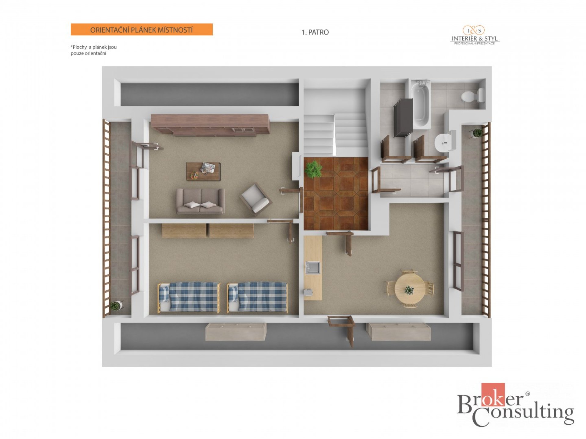 Všechny místnosti jsou světlé, prostorné a mají příjemnou atmosféru, která přímo vybízí k vytvoření nového domova. Dispozice domu působí velkoryse, ať už plánujete bydlení pro rodinu, dvougenerační řešení, nebo kombinaci s podnikáním.