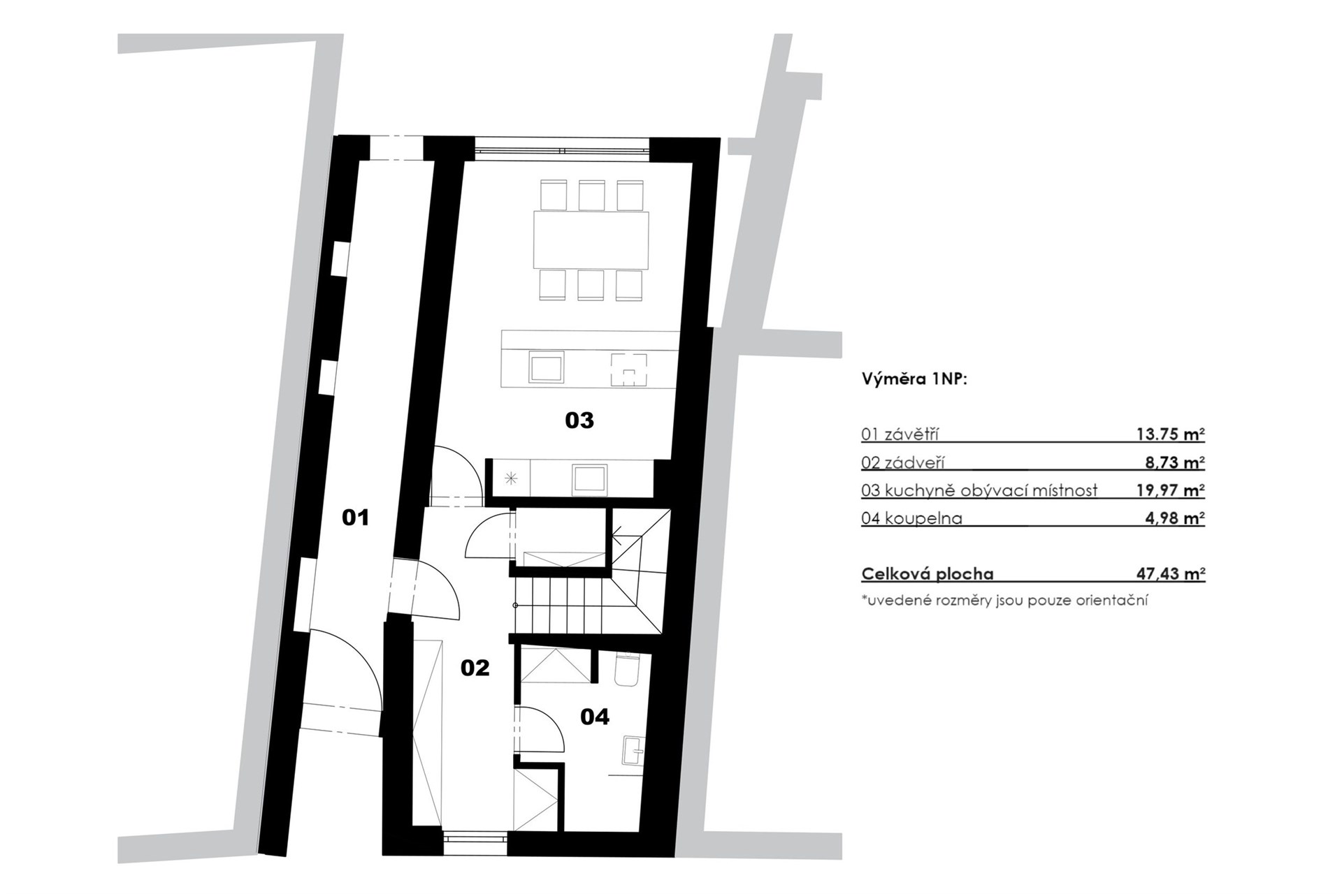 Při vstupu z ulice najdete exteriérovou chodbu, vedoucí na zahradu a zároveň i do domu. Dispozice zahrnuje vstupní zádveří s šatními skříněmi, prosklenou kuchyni s otevřeným stropem, jídelnou a vstupem na terasu, dále koupelnu se sprchovým koutem a komoru s úložným prostorem.