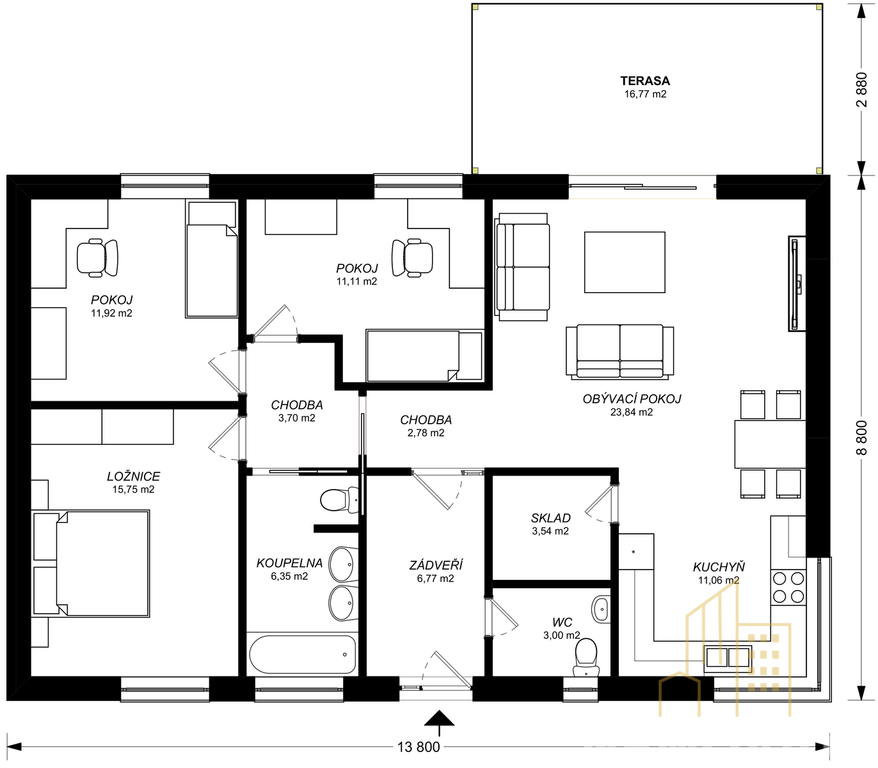 V domě naleznete ložnici a dva dětské pokoje, které poskytnou dostatek prostoru pro klidný spánek a soukromí každému členu rodiny. Součástí domu je také praktická šatna, technická místnost, samostatné WC a koupelna. Dům nabízí desítky variant uspořádání a designu, takže si můžete přizpůsobit interiér i exteriér přesně podle Vašich představ.