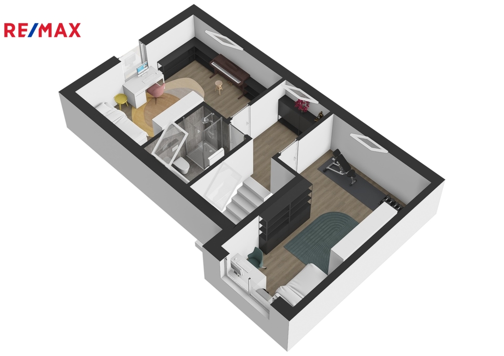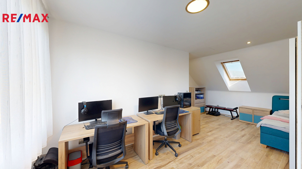 2.NP: schodiště 5,1 m2, chodba 5,3 m2, koupena s WC 5,2 m2, ložnice 20 m2, pokoj 21 m2.