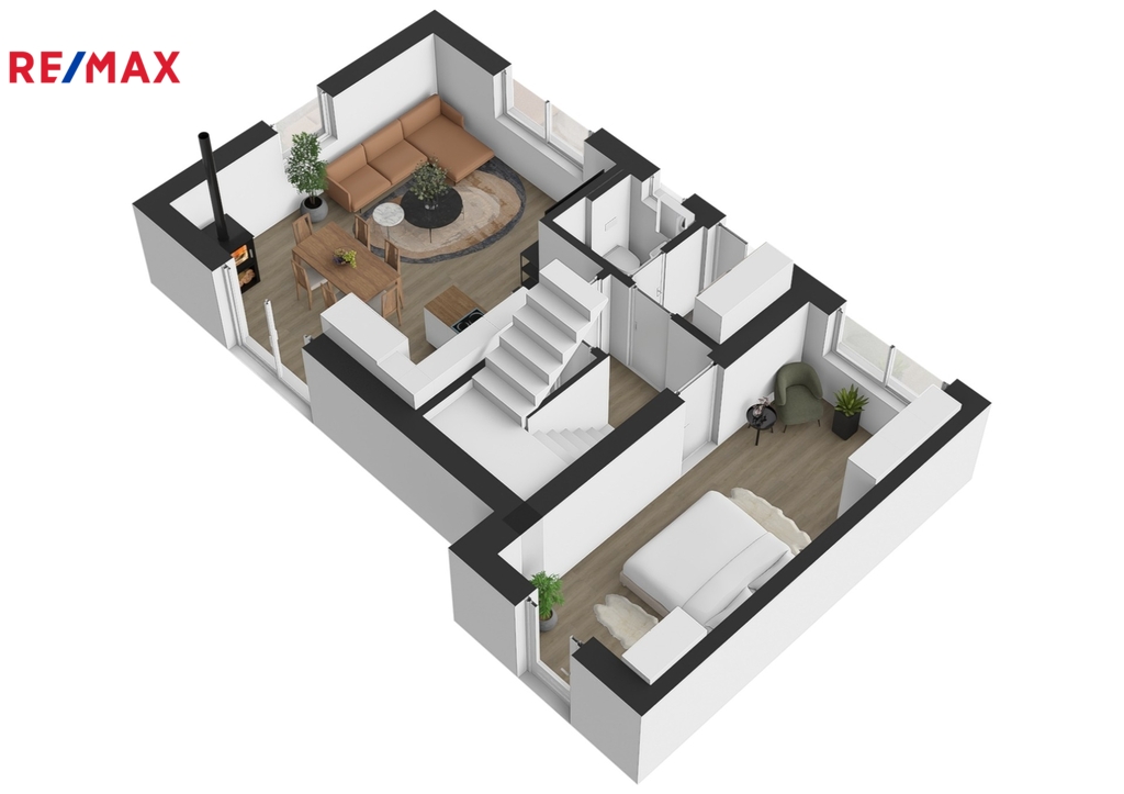 1NP: předsíň 2,7 m2, samostatné WC 2,1 m2, komora pod schody 3,4 m2, obývací pokoj , s kuchyňským koutem ( vybavený kuchyňskou linkou na míru, včetně kompletních spotřebičů ), krbem a vstupem na terasu 27 m2, pokoj 17 m2, se vstupem na zastřešenou terasu o výměře 42 m2 ( lze z ní vytvořit další pokoj o výměře cca 30 m2 ), chodba 2,6 m2, dřevěné schodiště do horního patra 2,6 m2.