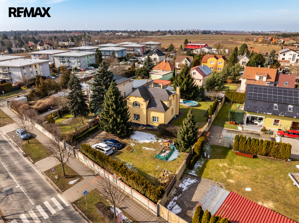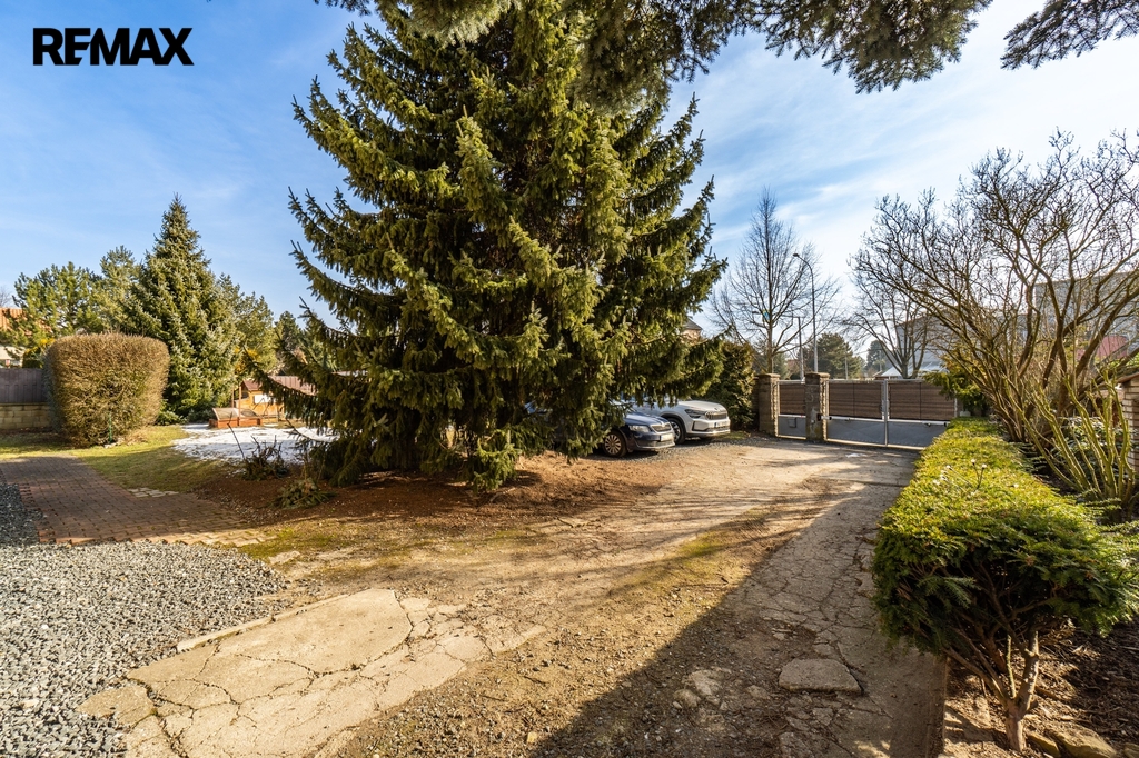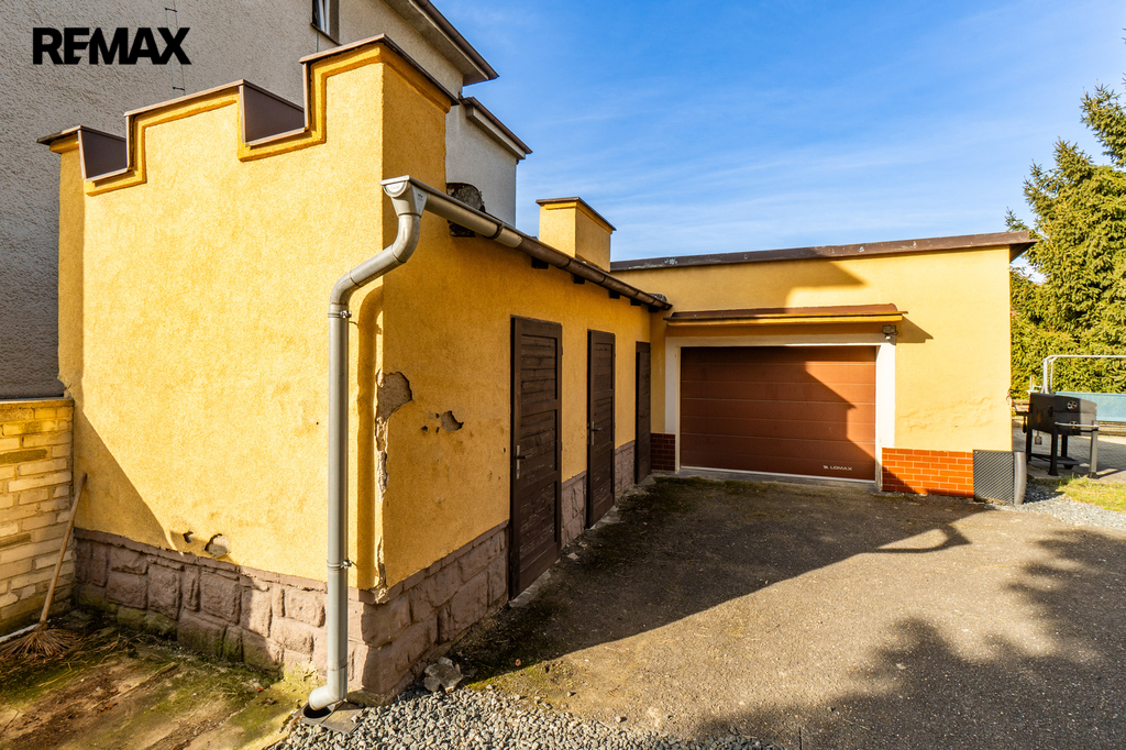 Dům je na pozemku se vzrostlými stromy situován s odstupem od hlavní komunikace. V přední části je příjezdová cesta s parkovací plochou pro 2 vozy a travnatá plocha se vzrostlou zelení. Za domem se nachází garáž pro jedno auto spojená s prostornou dílnou s montážní jámou, hospodářské zázemí, kopaná studna, nádrž na dešťovou vodu a bazén. Pozemek o celkové výměře 1205 m² je tak přirozeně rozdělen na klidovou zónu s velkou mírou soukromí a přední užitnou část.