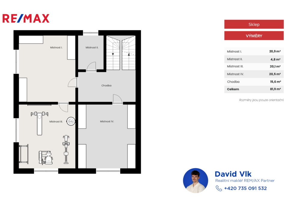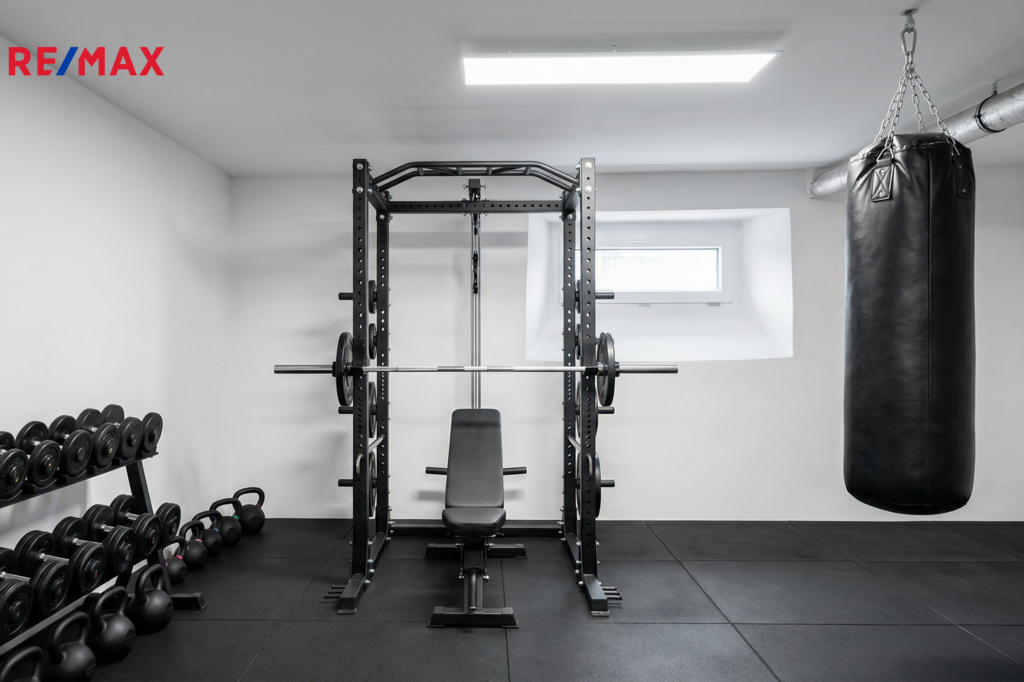 Dům má tři podlaží plus prostornou půdu. Sklepní podlaží o výměře 75 m² slouží jako technické a skladové zázemí – kotelna, sklad paliva a několik dalších místností využitelných jako dílna, hobby prostor nebo úložný prostor.