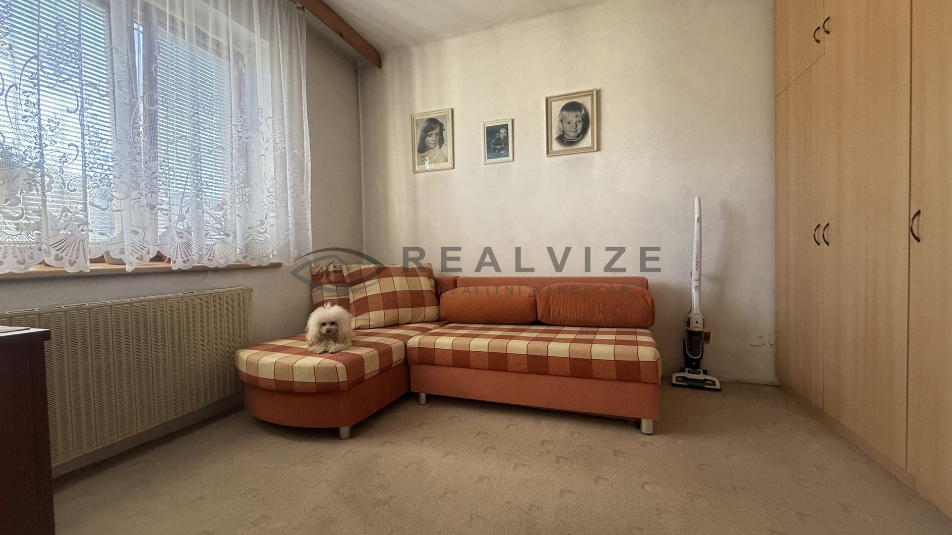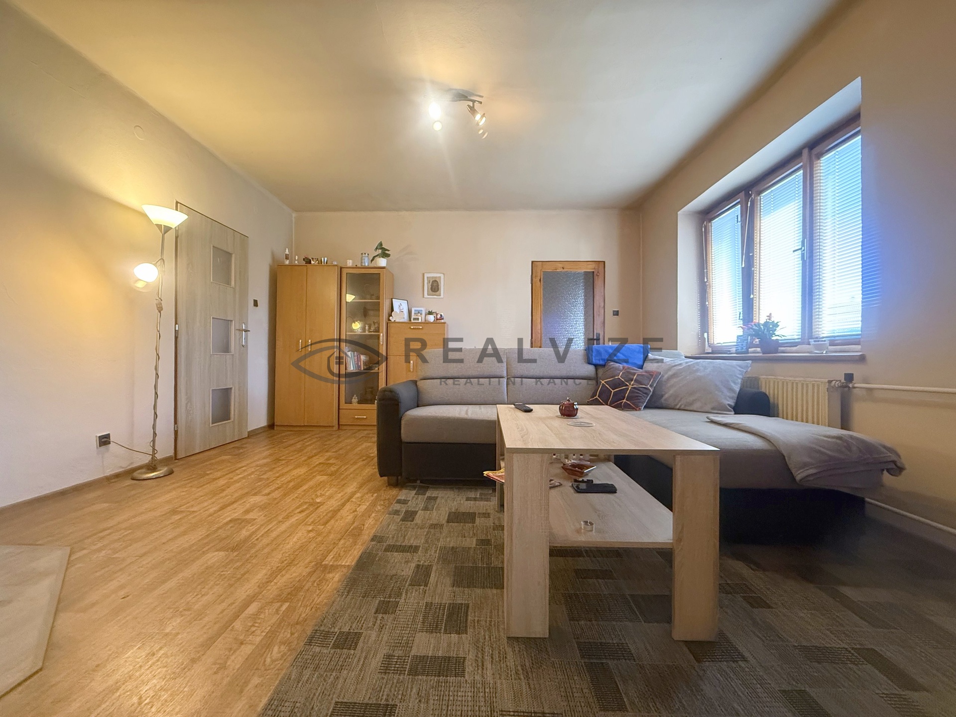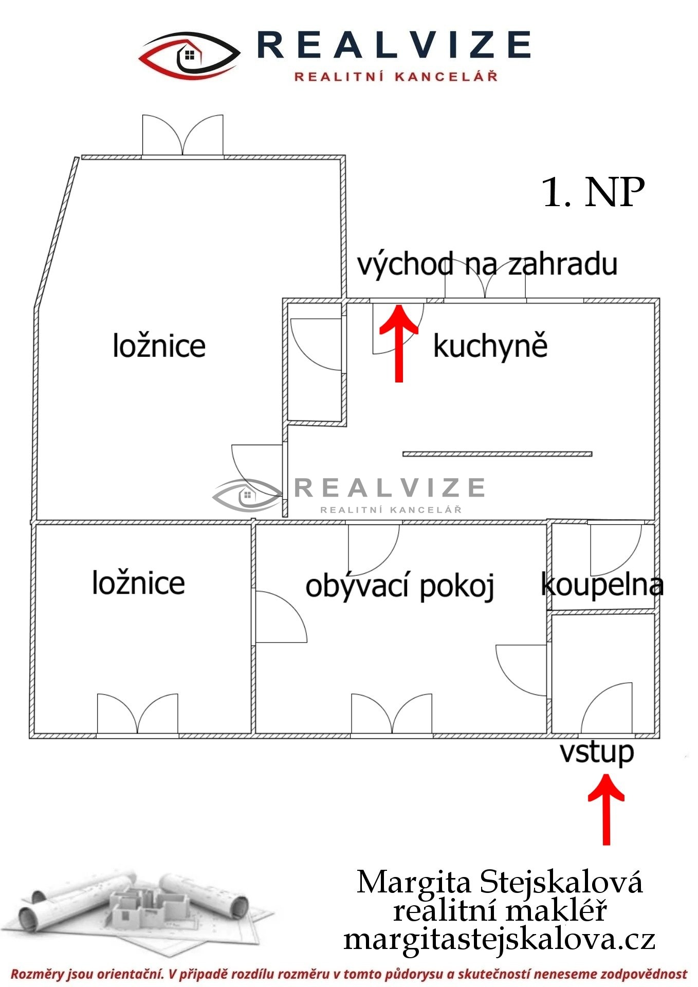 V přízemí je byt o dispozici 3+1 - vstup z ulice - vstupní chodba, obývací pokoj s krbovými kamny, ložnice, dětský pokoj, koupelna se sprchovým koutem + wc, komora a kuchyně se vstupem na zahradu.
