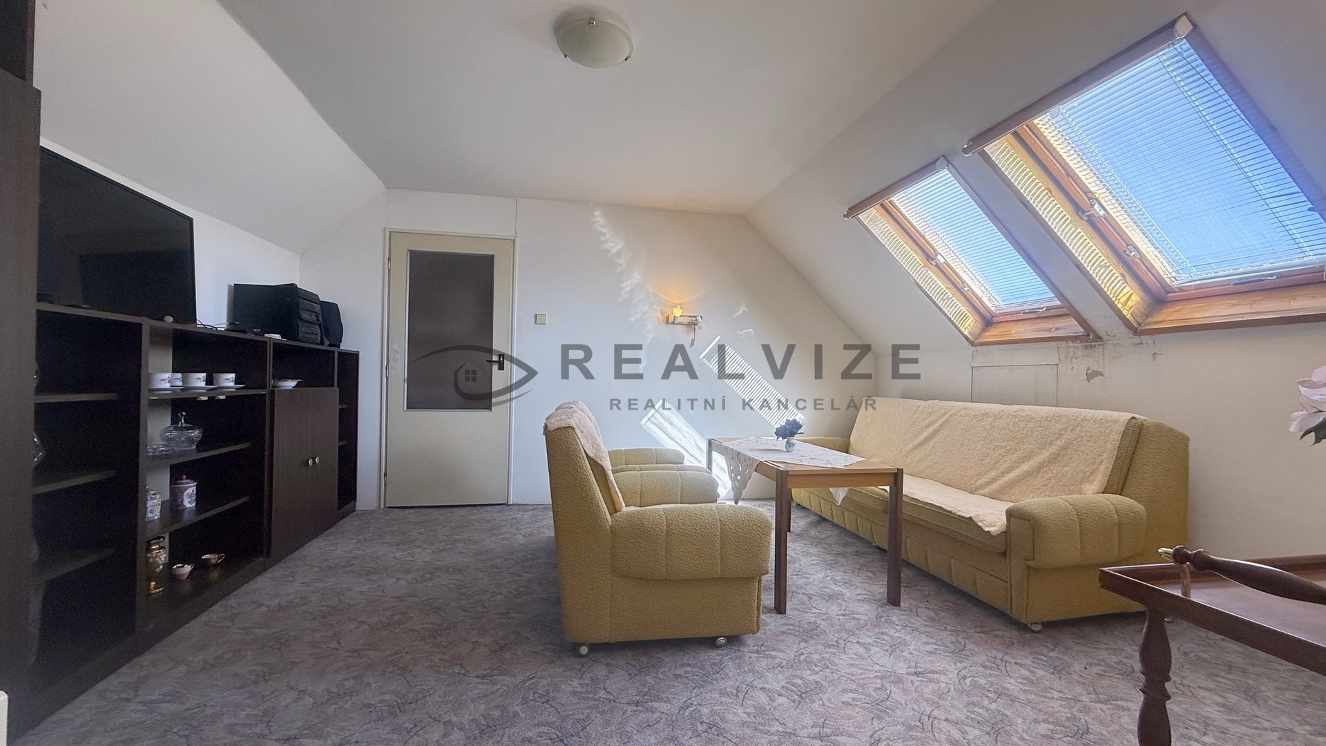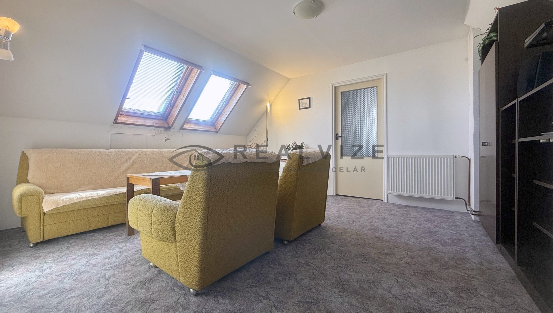 Za domem přes pavlač se prochází do prvního patra domu kde je podkrovní byt o dispozici 2+1 - kuchyně, obývací pokoj, ložnice a koupelna s vanu a wc.