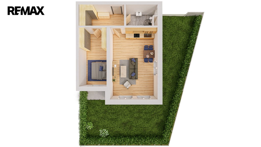 Byt o celkové ploše 66m² se nachází ve 1. nadzemním podlaží. Samotná obytná plocha činí 58,7 m² a zahrnuje prostorný obývací pokoj s kuchyňským koutem (30,4 m²), ložnici (14,5 m²), chodbu (8,4m²) a koupelnu s WC (5,4 m²). K bytu dále náleží zahrada o velikosti 68m² a praktická sklepní kóje (4,37 m²).
