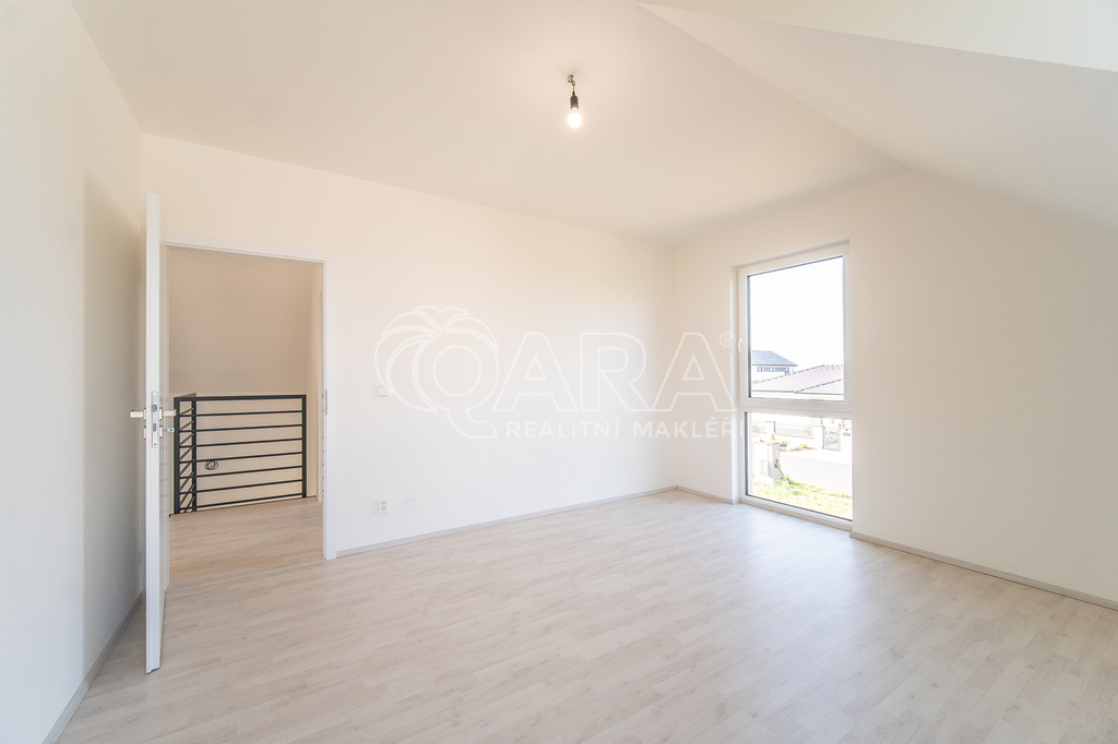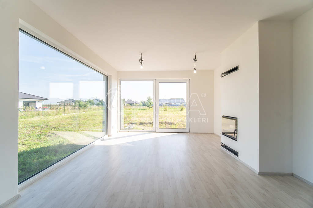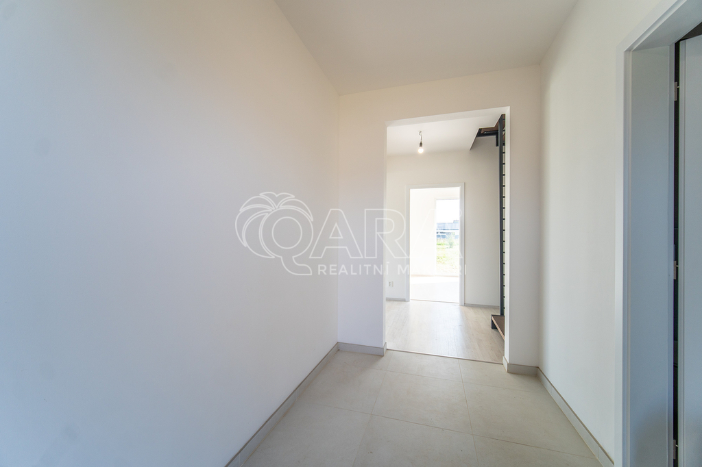 Po vstupu do domu vás přivítá vstupní hala, u které se nachází koupelna se sprchovým koutem, toaletou a technickým zázemím. Vstupní prostor je zařízen vestavěným nábytkem na míru, který ladí s designem kuchyňské linky. Chodbou se dostanete do prostorného obývacího pokoje (33 m²) propojeného s kuchyňským koutem, který je vybaven kvalitními spotřebiči Siemens. Dominantou této části je krb a přímý vstup na terasu. V přízemí se dále nachází jeden pokoj (12 m²), ideální jako pracovna či pokoj pro hosty, a schodiště do patra.