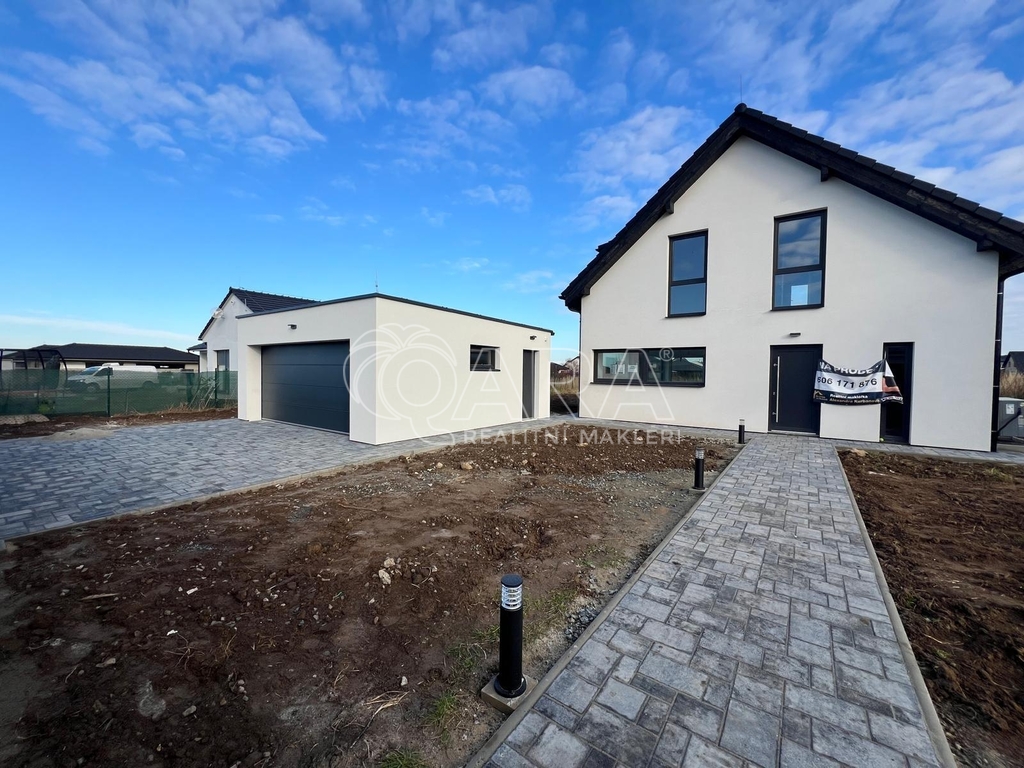 Dvougaráž o celkové ploše (39,44 m²) a oplocení před domem včetně vstupní branky a vjezdových vrat, stejně jako chodníky a venkovní osvětlení, byly dokončeny ke konci roku 2025, proto není na všech fotografiích.