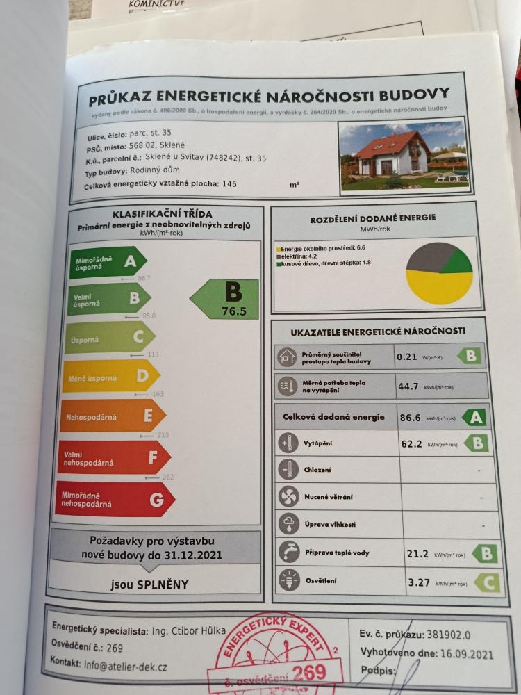 Rodinný dům je kolaudovaný v roce 2023, vysoce energeticky nenáročný a štítek energetické náročnosti je označen „B“ (velmi úsporné).
