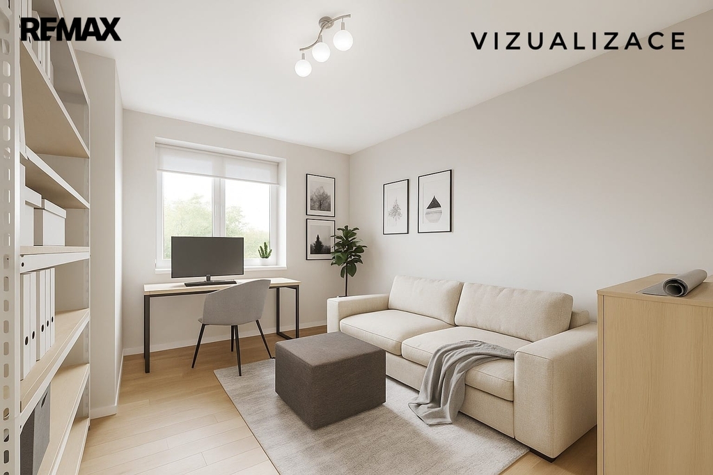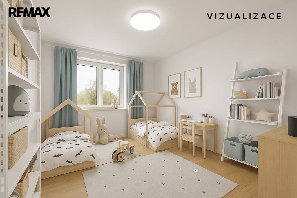 Dům dále nabízí tři samostatné pokoje, které mohou sloužit jako dětské pokoje, ložnice nebo pracovna. Dva z nich nejsou momentálně využívány, a proto jsou v inzerci doplněny vizualizacemi pro lepší představu o jejich budoucím využití.