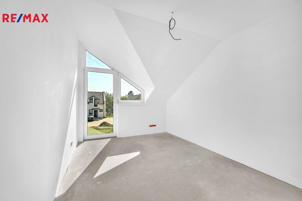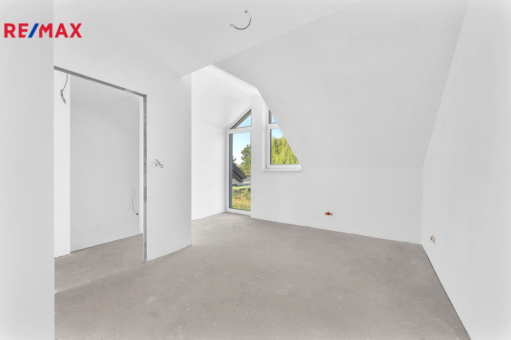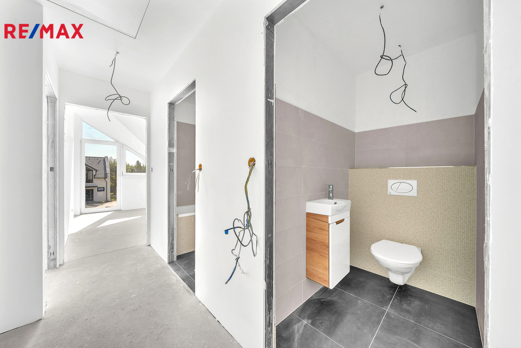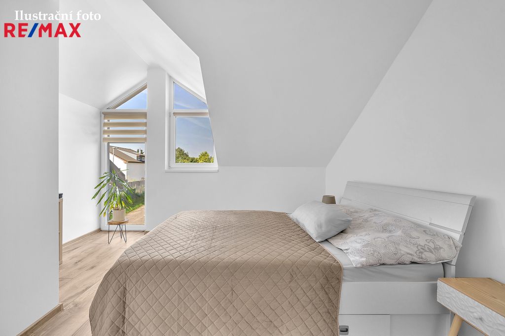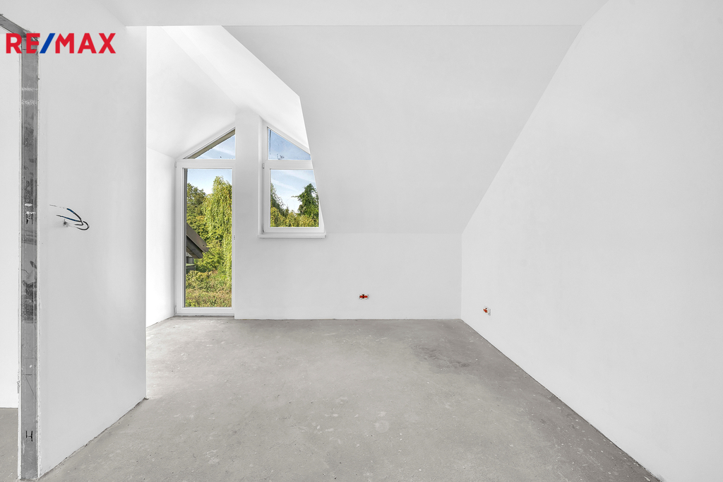 Podkroví ukrývá tři samostatné ložnice, koupelnu s vanou, samostatné WC a prostornou chodbu se vstupy do všech pokojů.