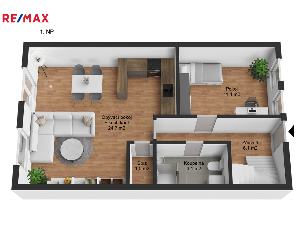Přízemí nabízí velký obývací pokoj s kuchyňským koutem, ideální pro rodinná setkávání, dále pokoj vhodný jako ložnice či pracovna, koupelnu s WC, komoru a vstupní zádveří.