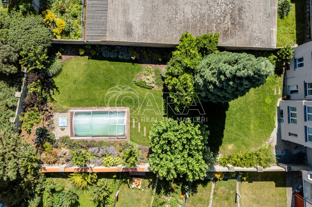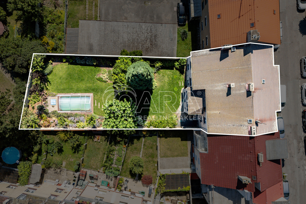 Kromě travnatých ploch a okrasných dřevin zde naleznete také grilovací pergolu a vyhřívaný krytý bazén s tepelným čerpadlem.