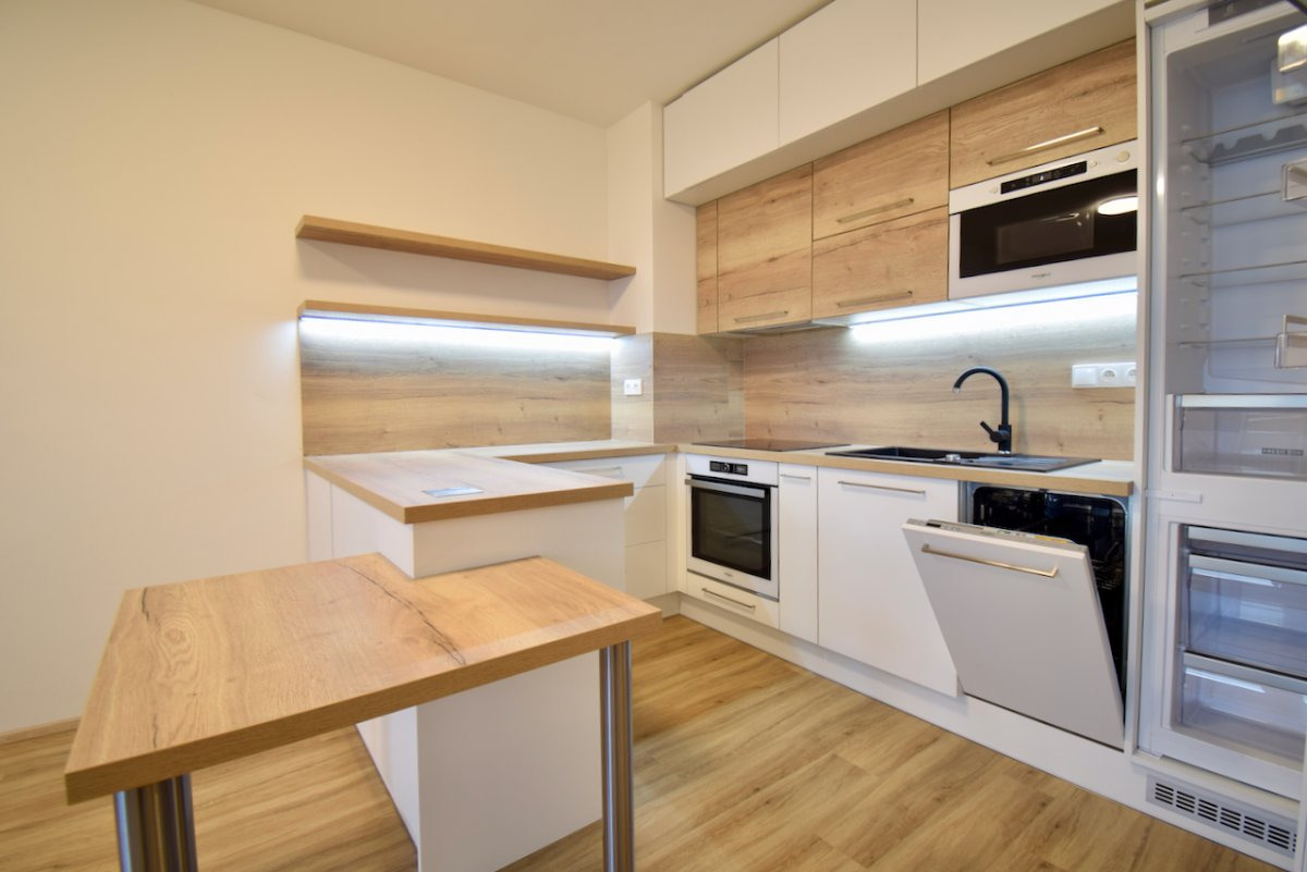 Dále se v bytě nachází prostorná ložnice s výhledem do klidného vnitrobloku. Obývací pokoj s kuchyňským koutem disponuje lednicí, mrazákem, troubou, varnou deskou, digestoří a myčkou. Kuchyňská linka byla vyrobena na zakázku.