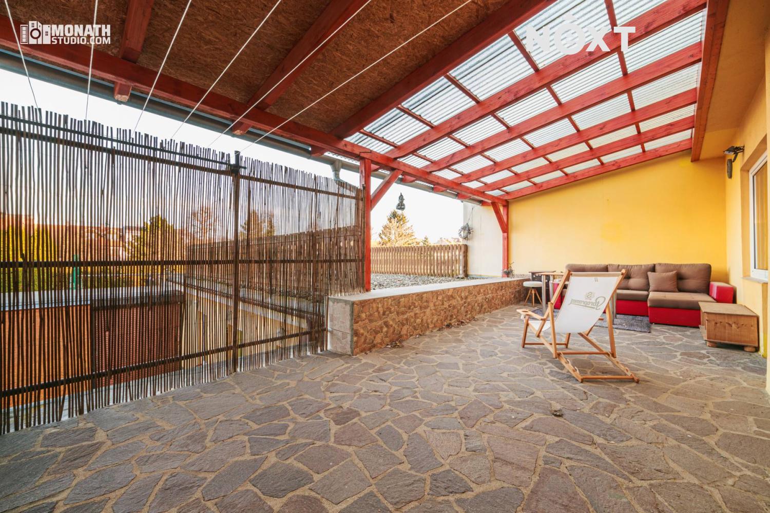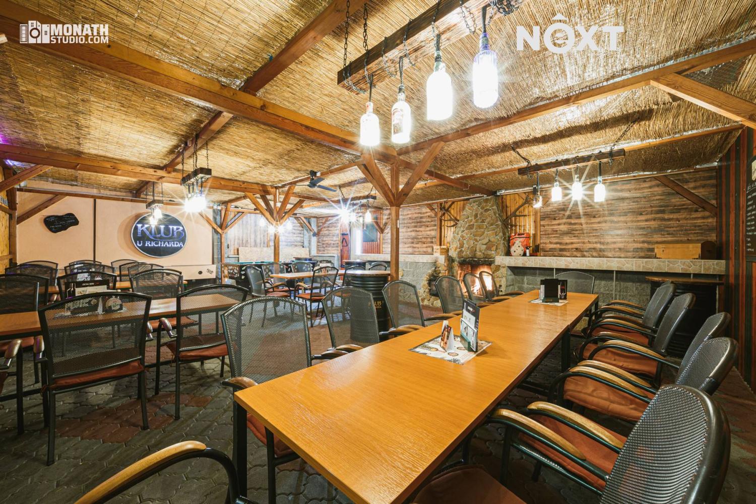 - stylová venkovní zastřešená terasa s krbem a kulečníkem