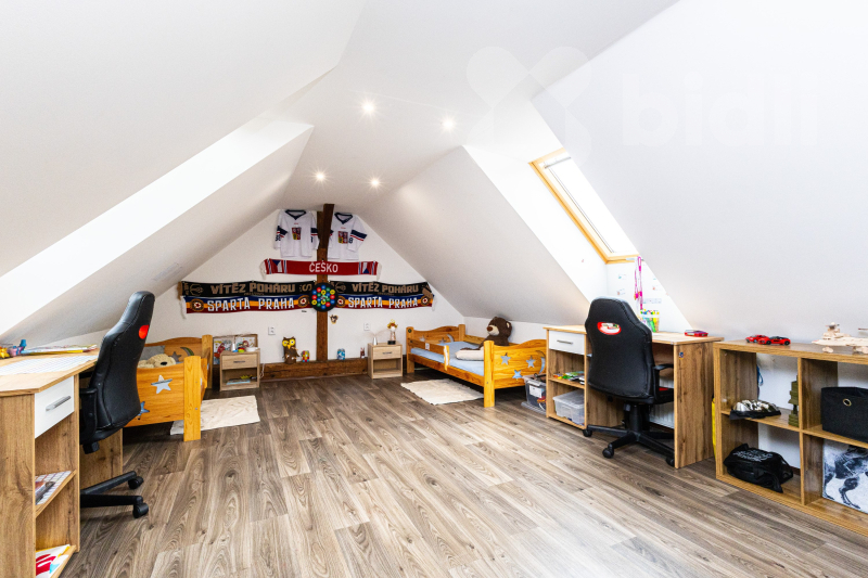 Dispozičně nabízí přízemí chodbu o velikosti 9,12 m2, kuchyni 7,5 m2, koupelnu 6,4 m2, pokoj s kamny 16,01 m2, obývací pokoj 16,73 m2 a WC s úklidovou místností o 2,7 m2. V podkroví je dětský pokoj o 20 m2, ložnice o 16 m2 a chodba o velikosti 8 m2. Sklep v suterénu má 13,2 m2. Parkování je možné pohodlně na veřejných místech přímo u domu.